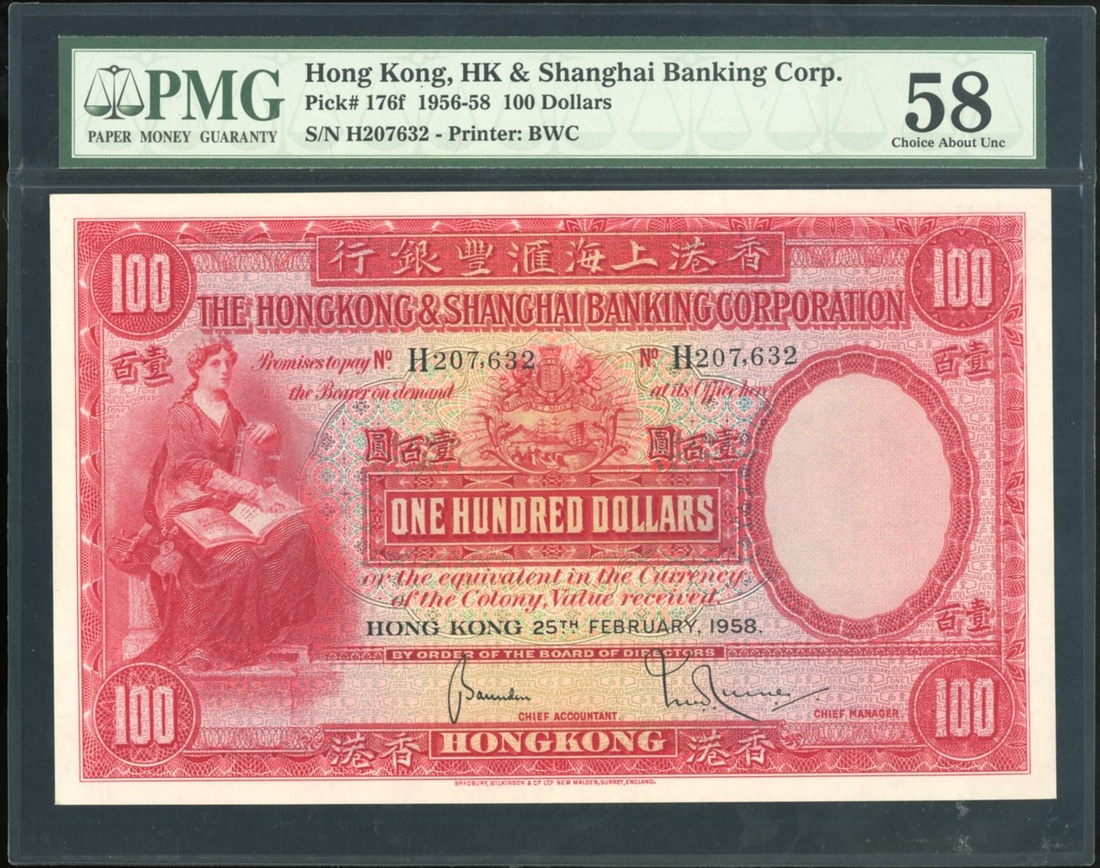 Hong Kong & Shanghai Banking Corporation, $100, 25.2.1958, serial number H 207632, (Pick 176f), PMG 58, choice about uncirculated.