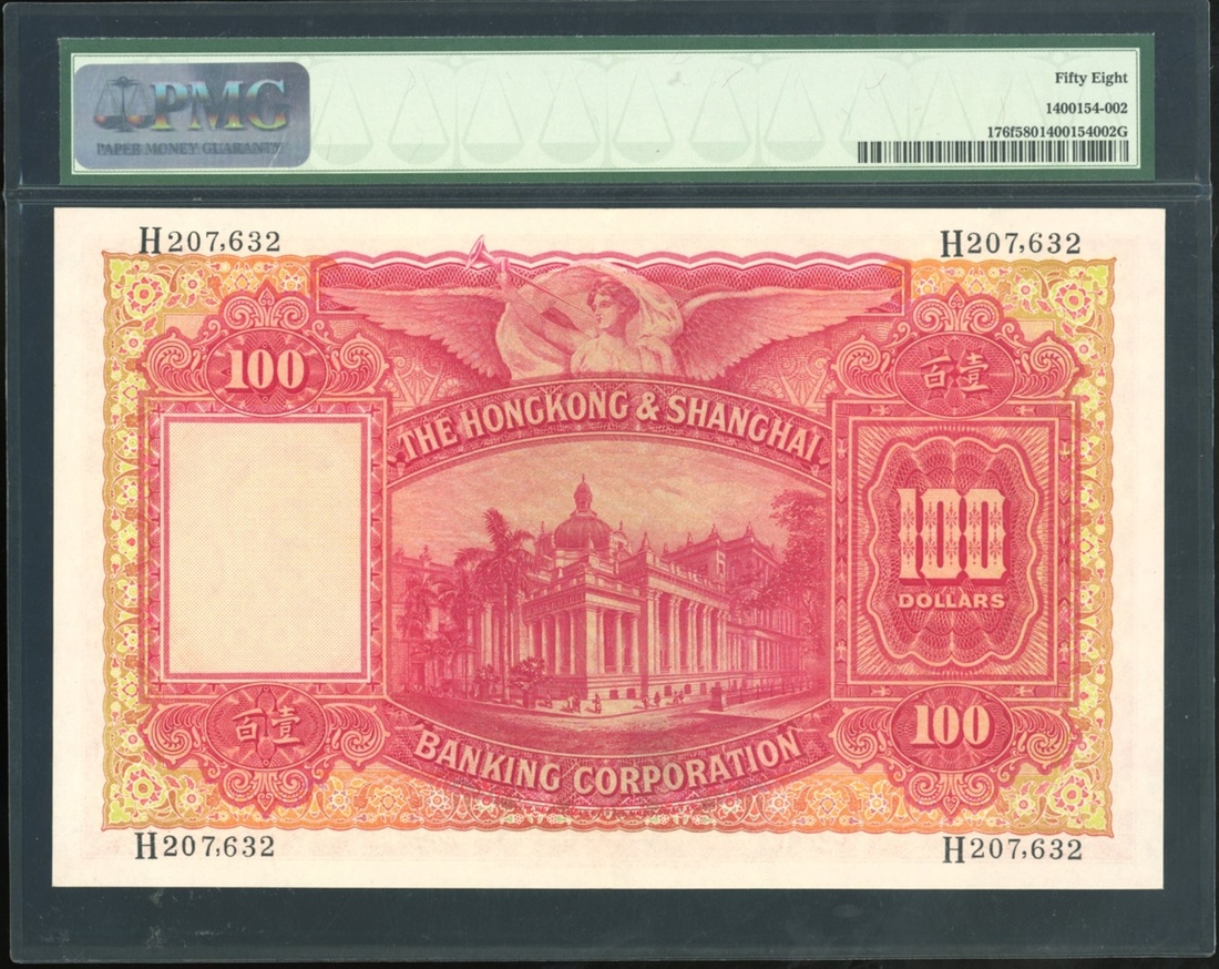 1958年香港上海匯豐銀行100元,編號H 207632,PMG 58