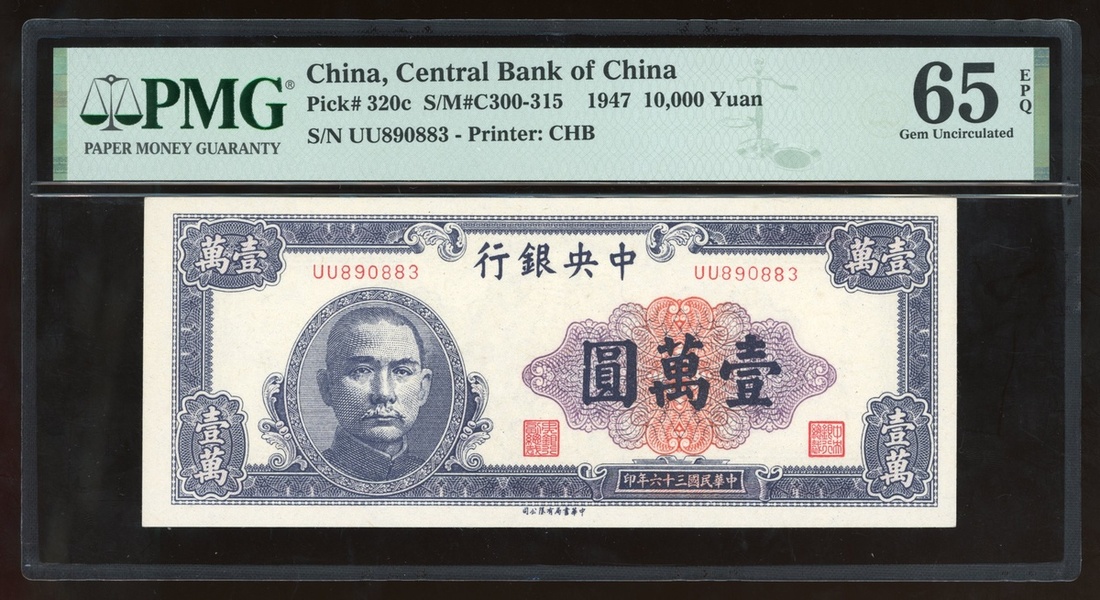Central Bank of China, 10000 yuan, Year 36(1947), serial number UU890883, (Pick 320c), PMG 65EPQ Gem Uncirculated.