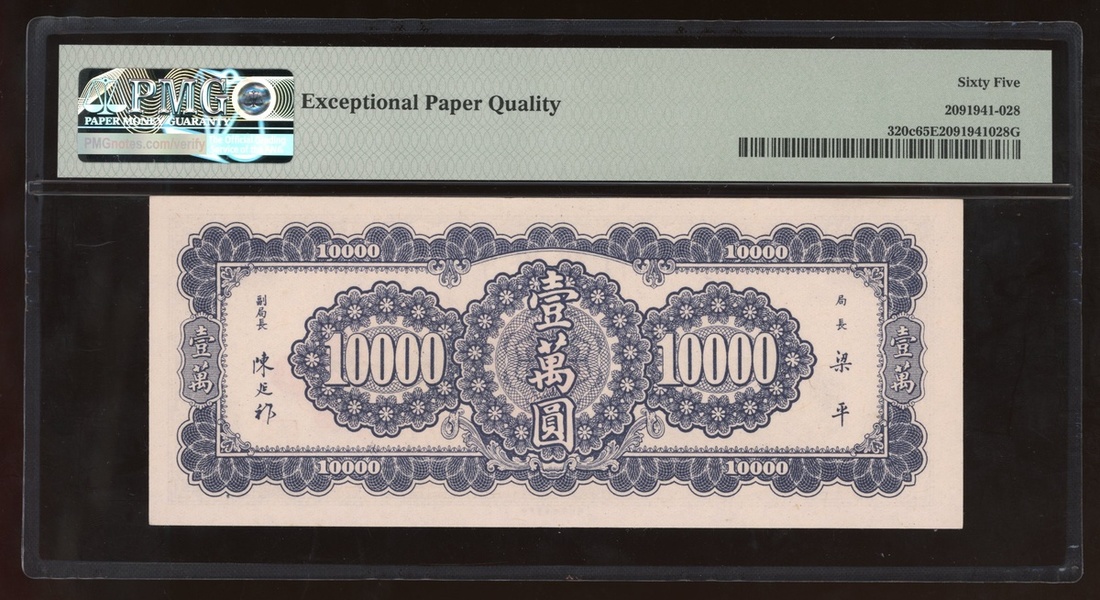 民國三十六年中央銀行壹萬圓,編號UU890883,PMG 65EPQ