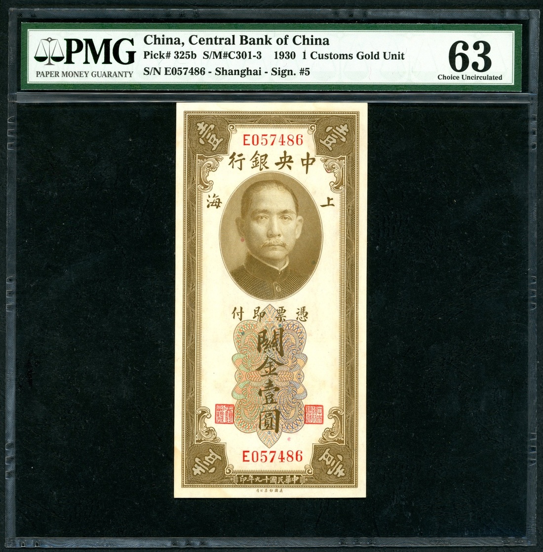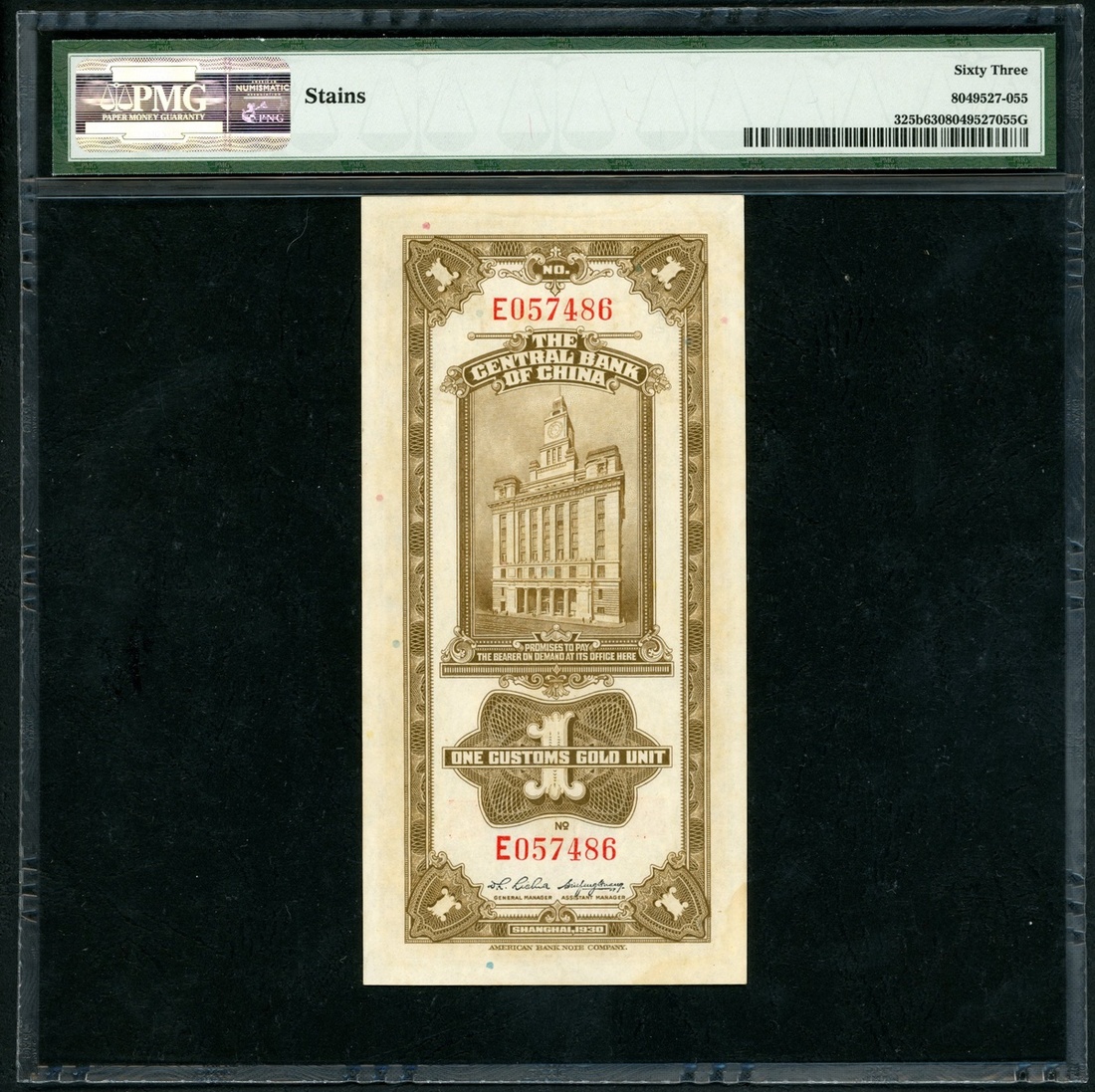 Central Bank of China, 1 Customs Gold Unit, Shanghai, Year 19(1930), serial number E057486, printed by ABNC,