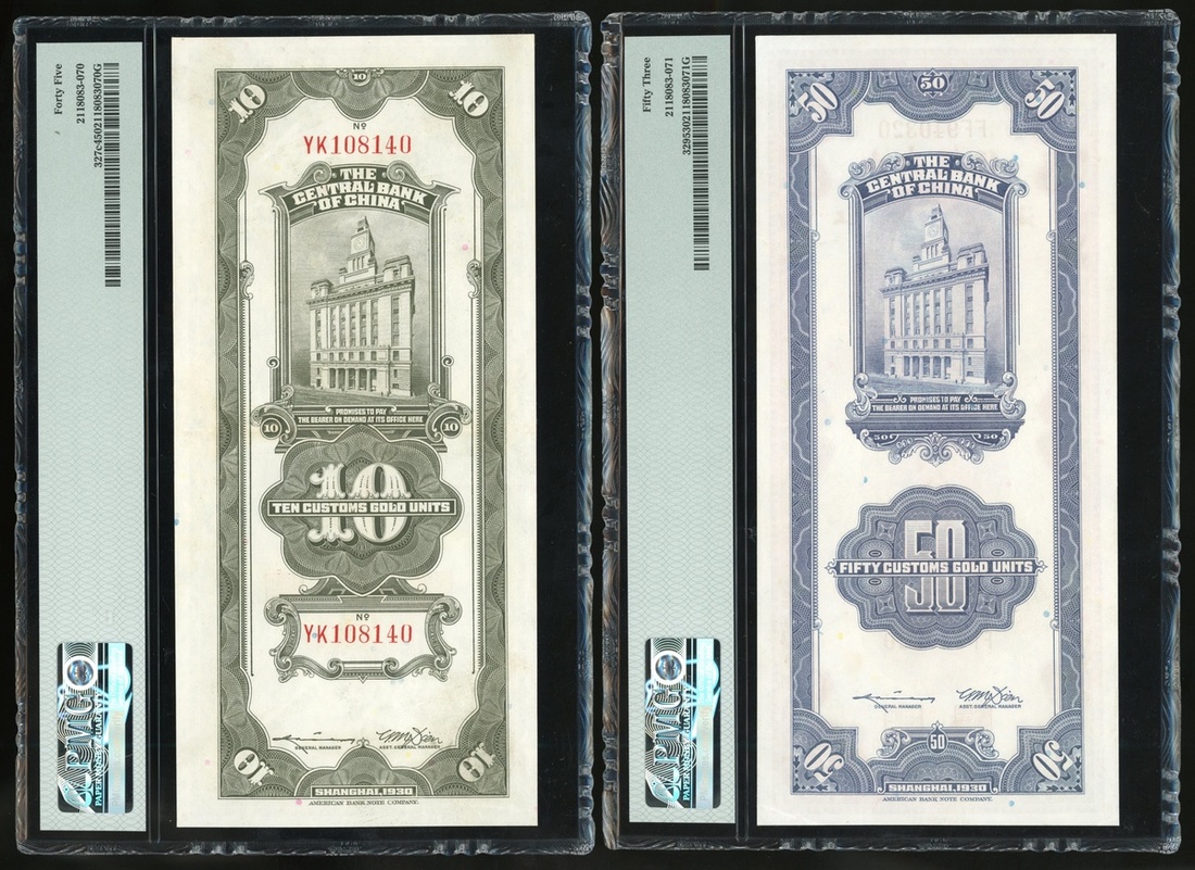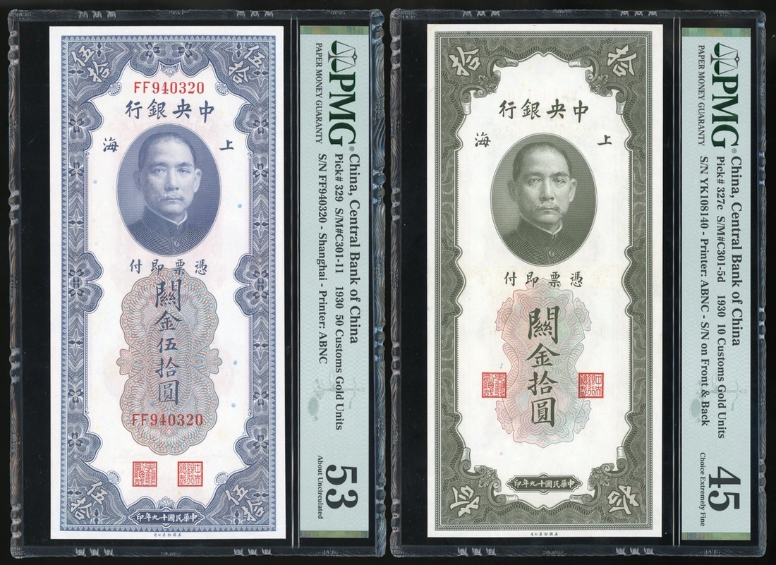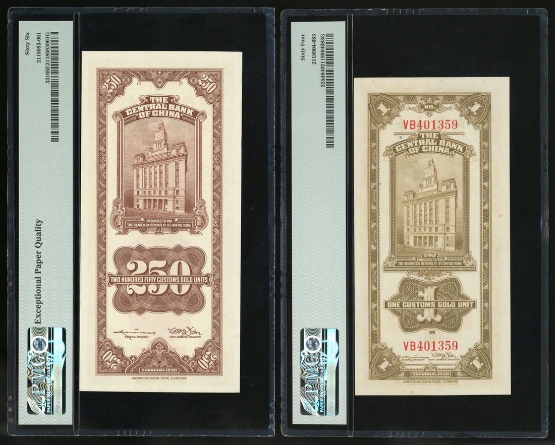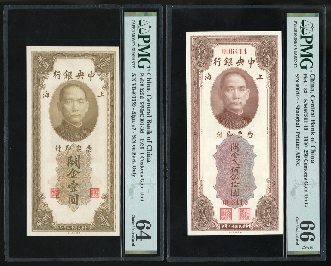 The Central Bank of China, a group of 4, consisting of: 250, 1, 10 and 50 Custom Gold Units, Shanghai, 1930, serial numbers 006414, VB401359, YK108140 and FF940320,