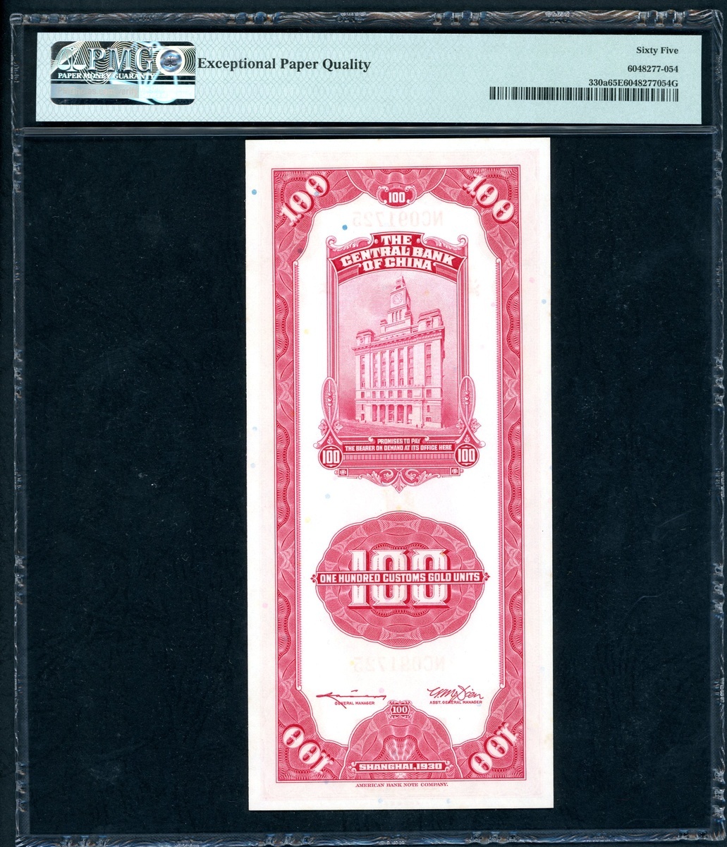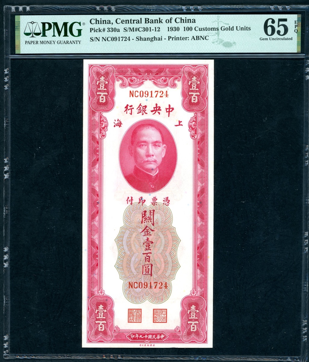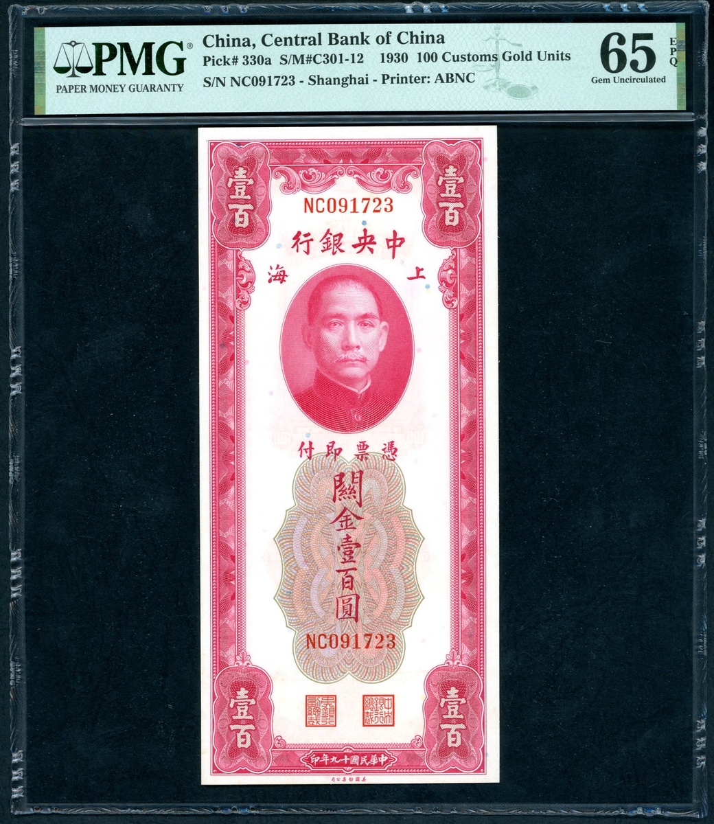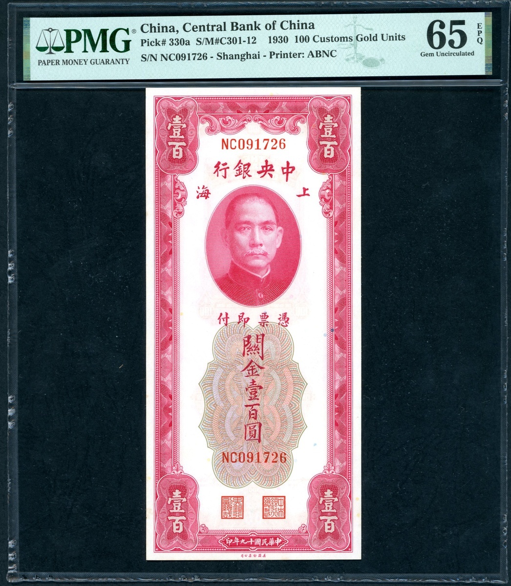 The Central Bank of China, a group of 4x 100 Custom Gold Units, 1930, consecutive serial numbers NC091723-726, (Pick 330a), PMG 65EPQ Gem Uncirculated (4)