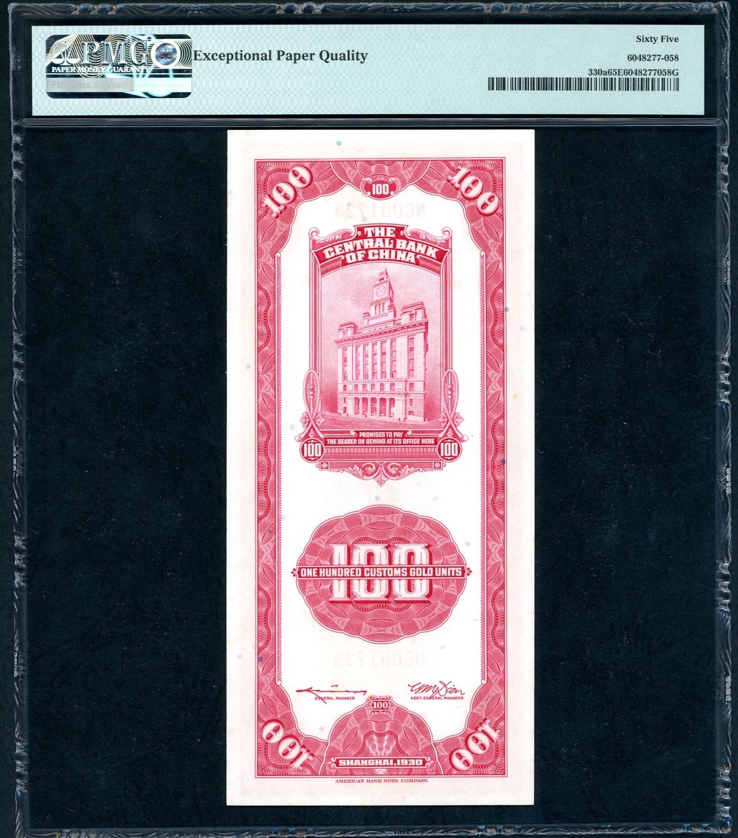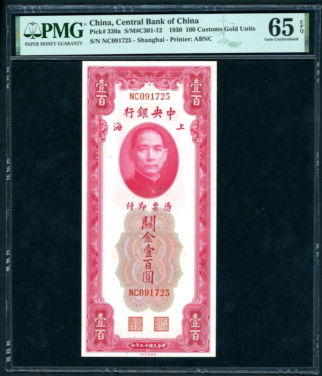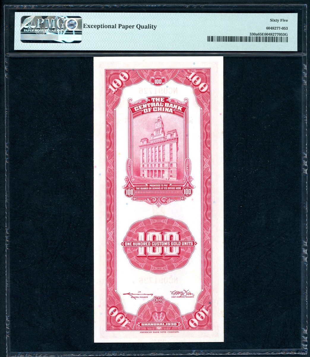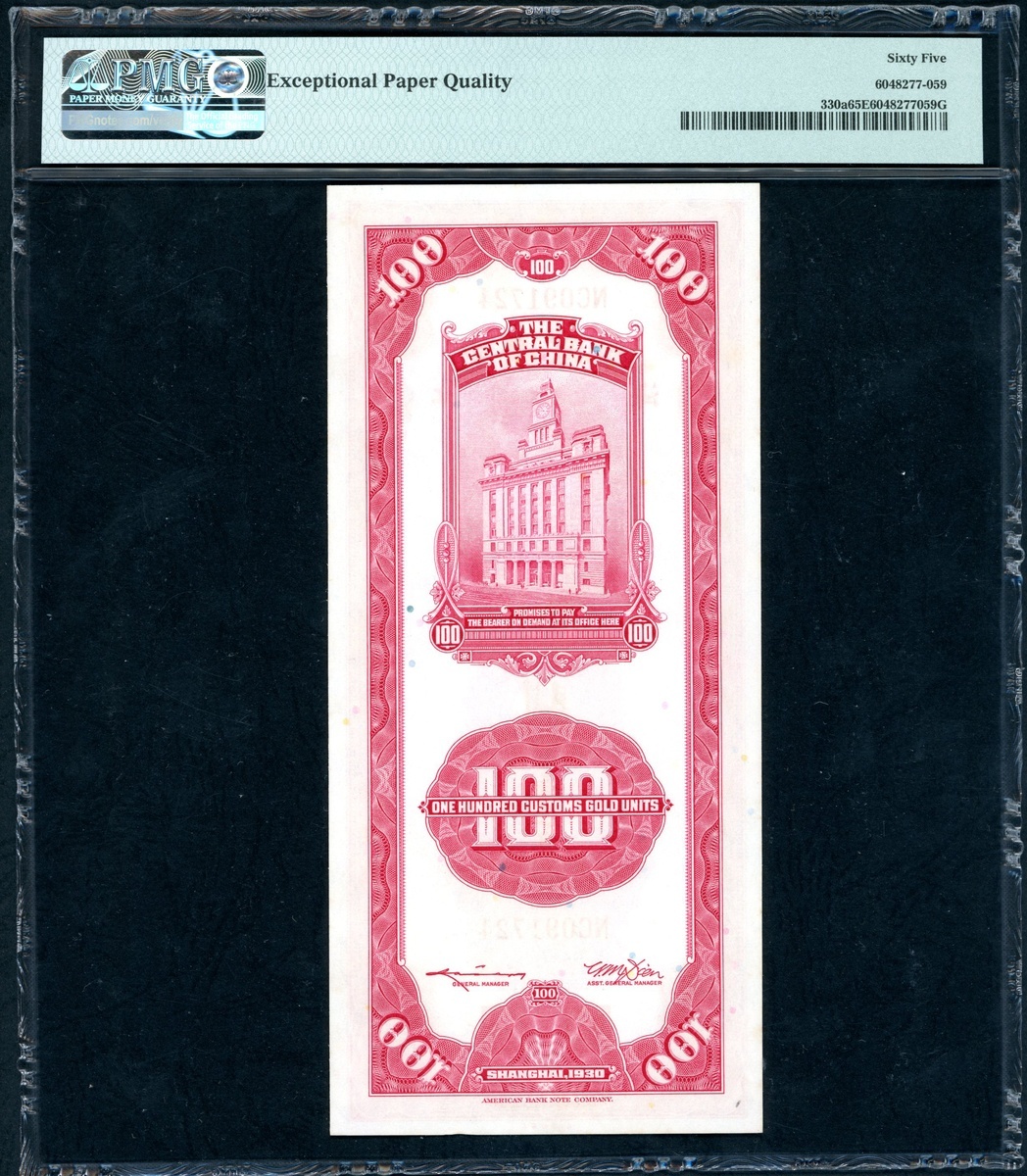 The Central Bank of China, a group of 4x 100 Custom Gold Units, 1930, consecutive serial numbers NC091723-726, (Pick 330a), PMG 65EPQ Gem Uncirculated (4)