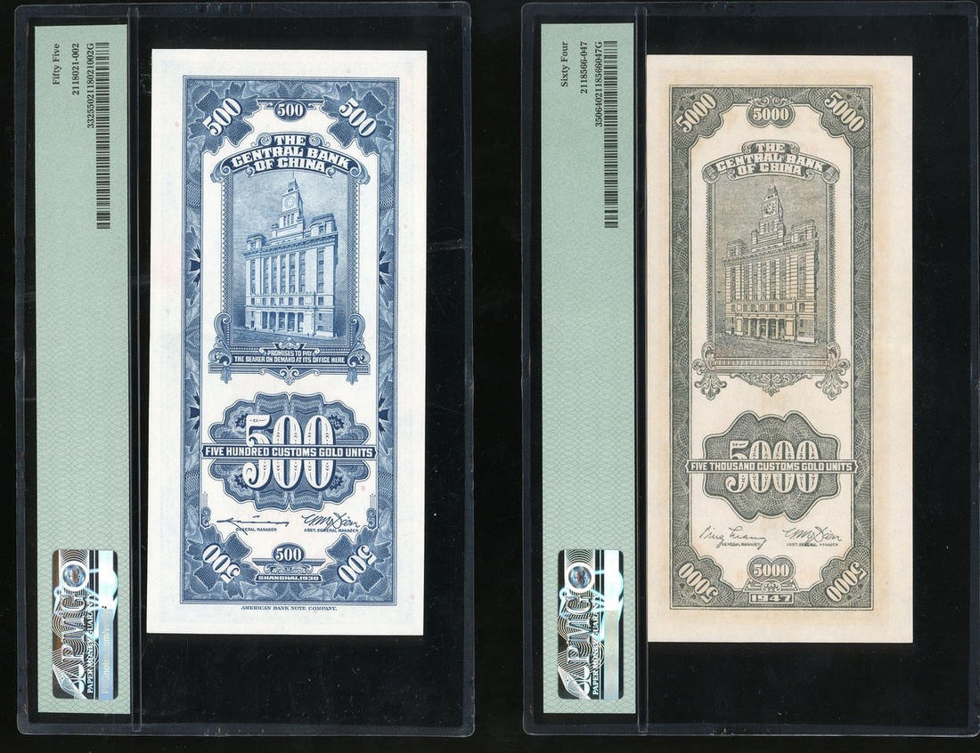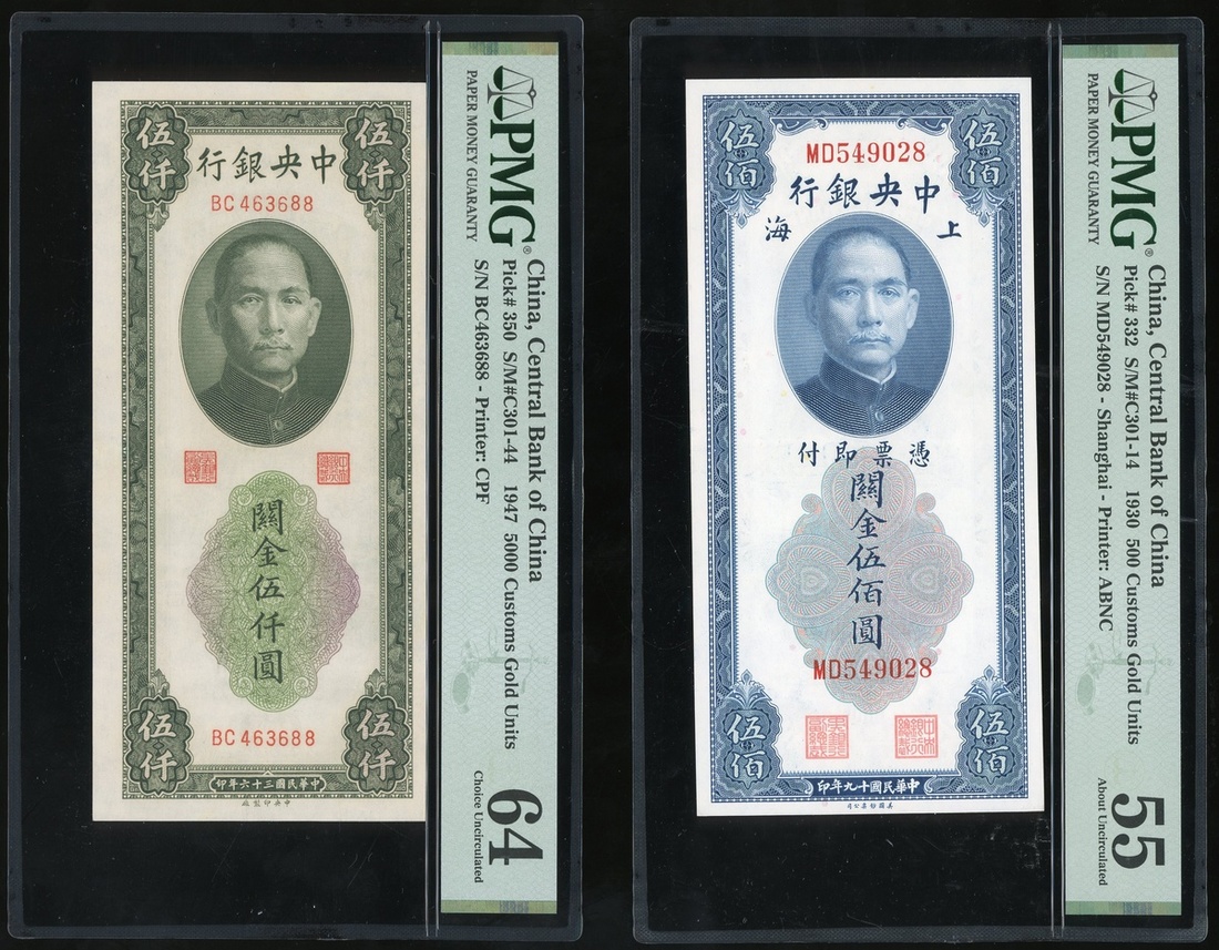 The Central Bank of China, 500 CGU, 1930 and 5000 CGU, 1947, serial numbers MD549028 and BC463688, (Pick 332, 350), graded PMG 55 and 64 respectively (2)