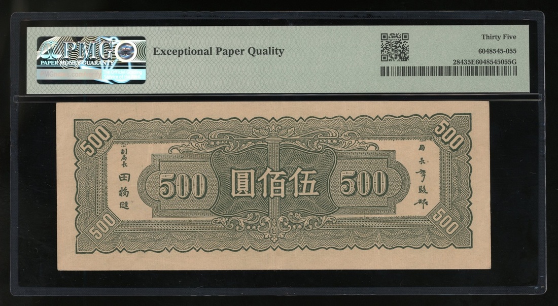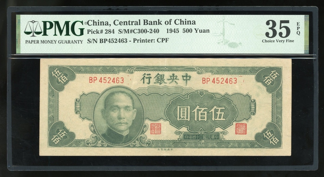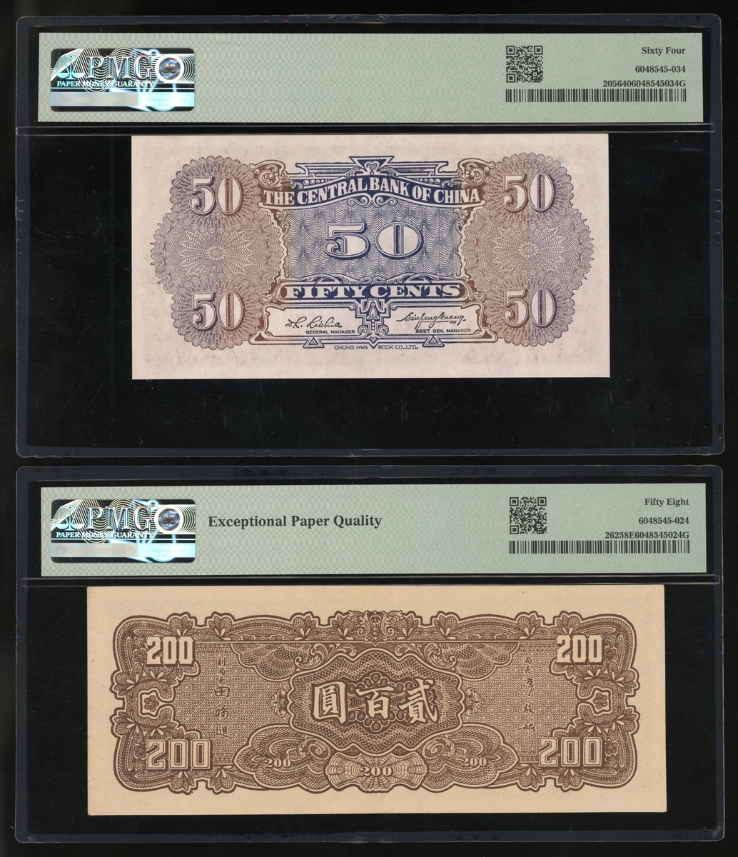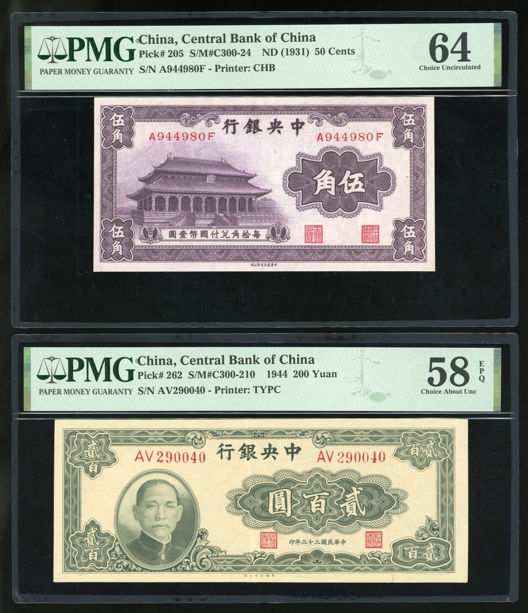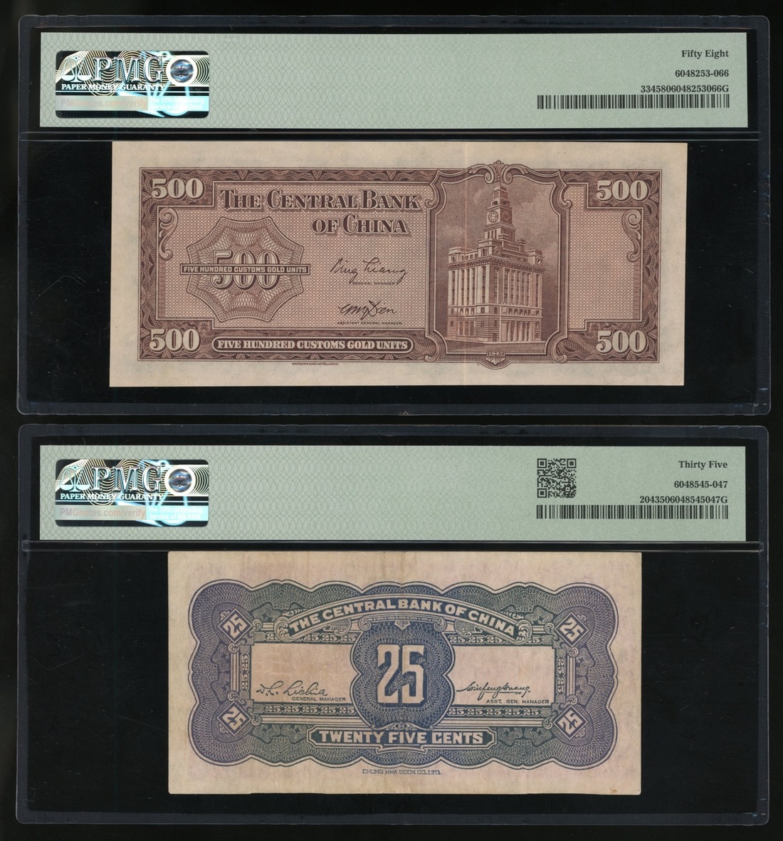 The Central Bank of China, a group of 5, consisting of: 500 Custom Gold Units, 1947; 25 cents, ND (1931); 50 cents, ND (1931); 200 yuan, Year 33 (1944); 500 yuan, Year 34 (1945); serial numbers B/D 589826, A948371P, A944980F, AV290040 and BP452463;