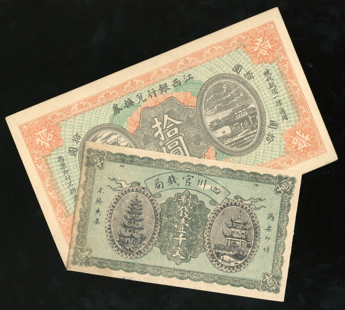 民國時期地區鈔票,包括民國十三年四川錢局一千文及民國五年江西銀行兌換券拾圓,編號229326,AF及AU