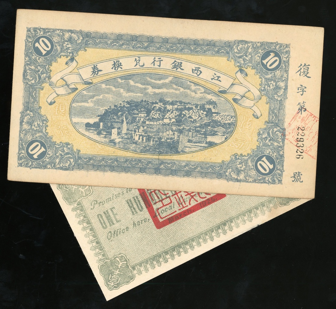 China, a pair of provincial notes, consists of Szechuan Provincial Bank, 100 copper coins, 1924, and Bank of Kiangsi, 10 yuan, Year 5(1916), serial number 229326, (Pick S2808 and S1102), above fine to about uncirculated respectively (2).