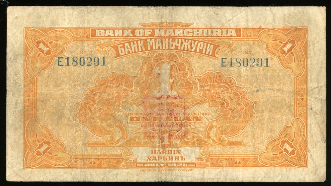 Bank of Manchuria, China, 1 yuan, 1921, serial number E180291, oveprint at centre,