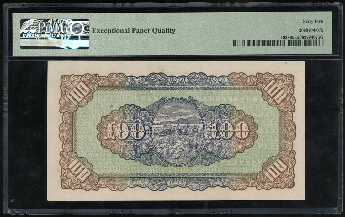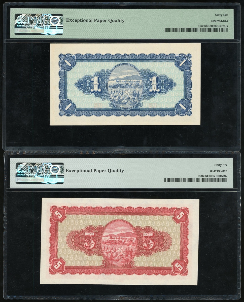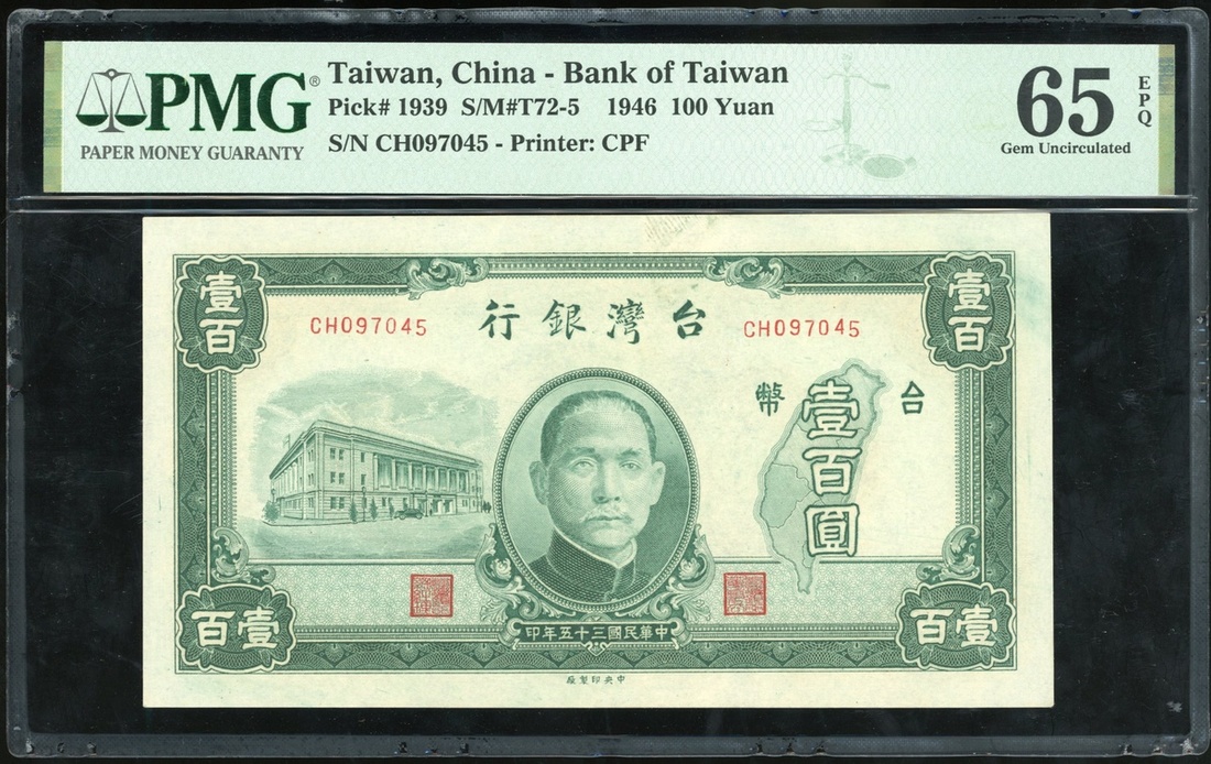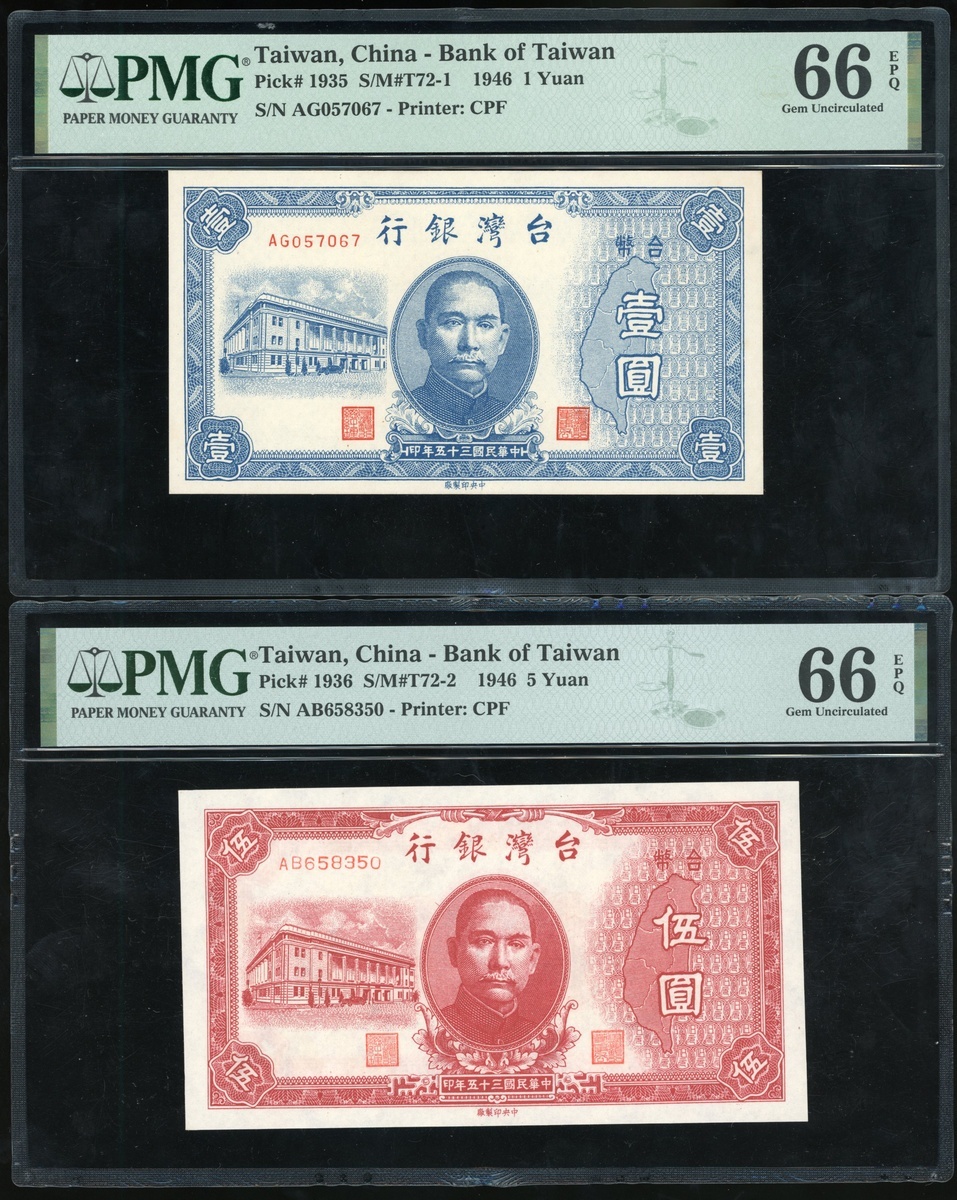 Bank of Taiwan, a group of 3 notes, consists of 1, 5 and 100 yuan, Year 35(1946), serial numbers AG057067, AB658350 and CH097045, (Pick 1935, 1936 and 1939), graded PMG 66EPQ, 66EPQ and 65EPQ respectively (3)