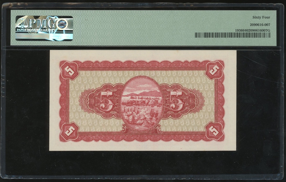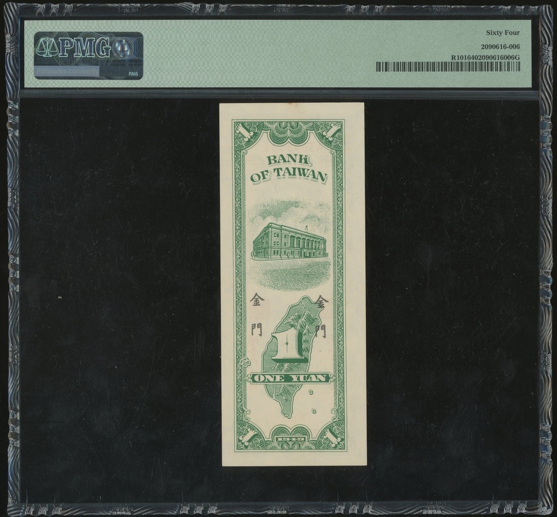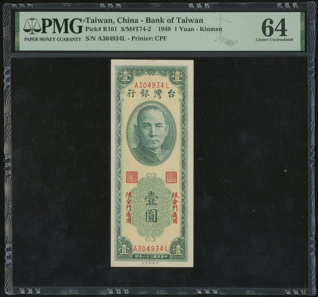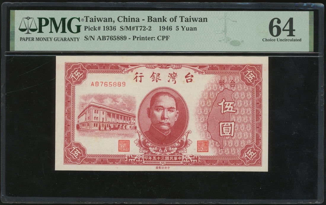 Bank of Taiwan, a pair of 5 yuan, Year 35(1946), and 1 yuan, Kinmen, Year 38(1949), serial numbers AB765889 and A304934L, (Pick 1936 and R101), both graded PMG 64 Choice Uncirculated (2).