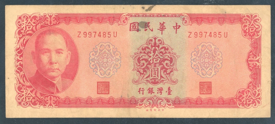Bank of Taiwan, 10 yuan, 1969, Error, overlapped printing on reverse, serial number Z997485U, red and light blue underprint, Sun Yat Sen at left,