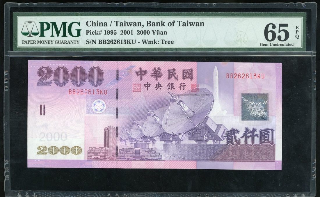 Bank of Taiwan, 2000 yuan, Year 90 (2001), serial number BB262613KU, (Pick 1995), PMG 65EPQ Gem Uncirculated