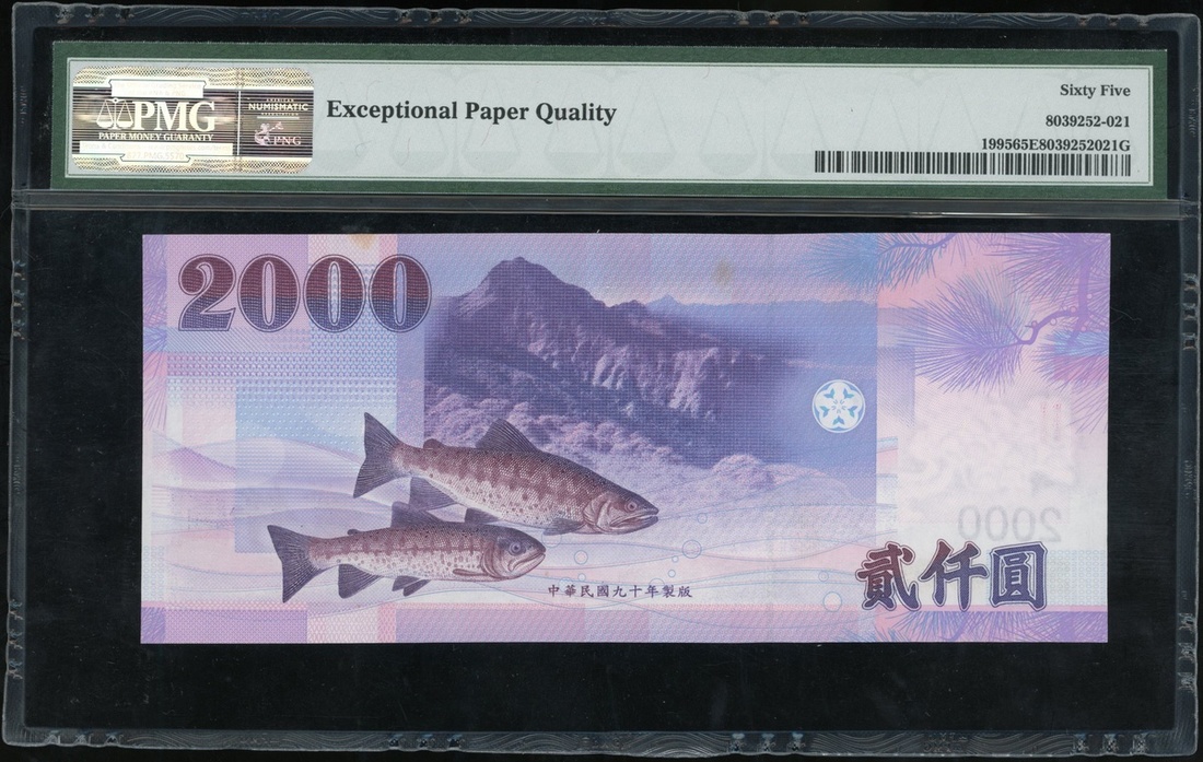 民國九十年台灣銀行貳仟圓,編號BB262613KU,PMG 65EPQ