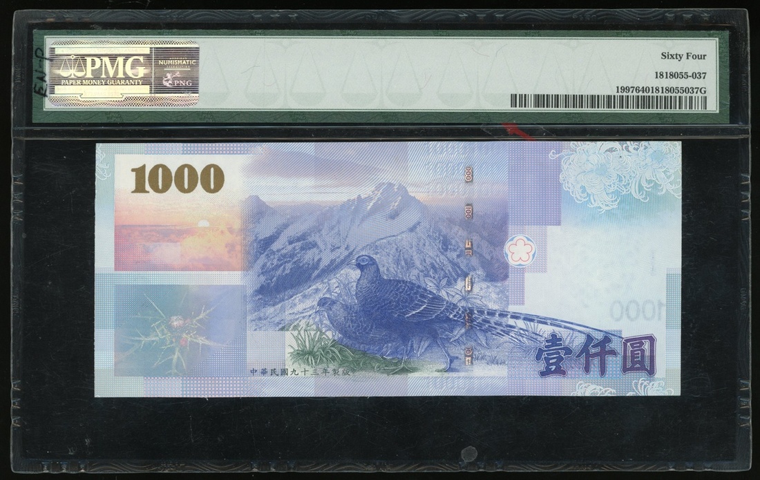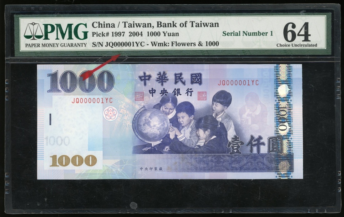 Bank of Taiwan, 1000 yuan, 2004, serial number JQ000001YC, (Pick 1997), PMG 64 Choice Uncirculated