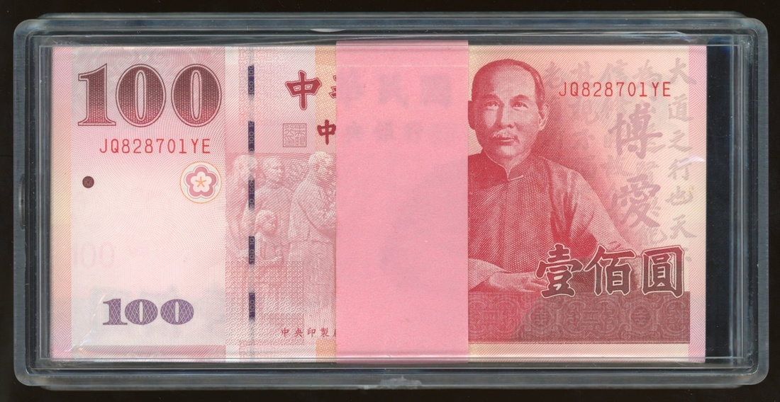 Bank of Taiwan, 100 yuan, 2011, pack of 100 consecutive notes, serial numbers JQ828701YE-JQ828800YE, 100th Anniversary of Republic of China commemorative issue,