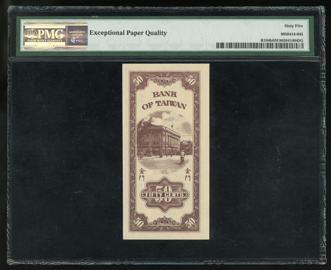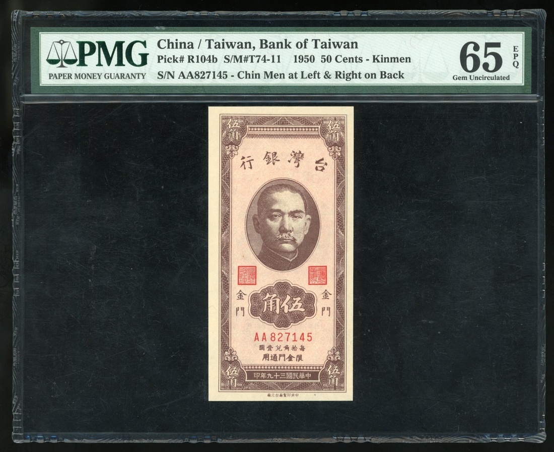 Bank of Taiwan, China, 50 cents, Year 39 (1950), Kinmen, serial number AA827145, (Pick R104b), PMG 65EPQ Gem Uncirculated