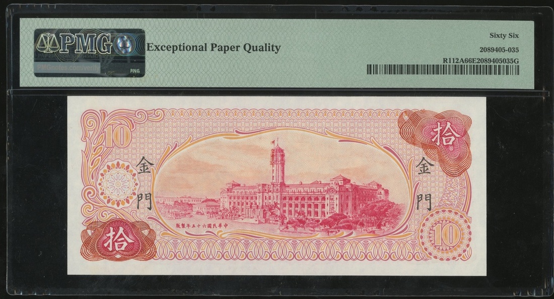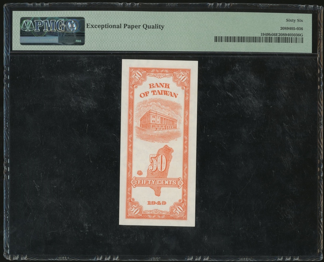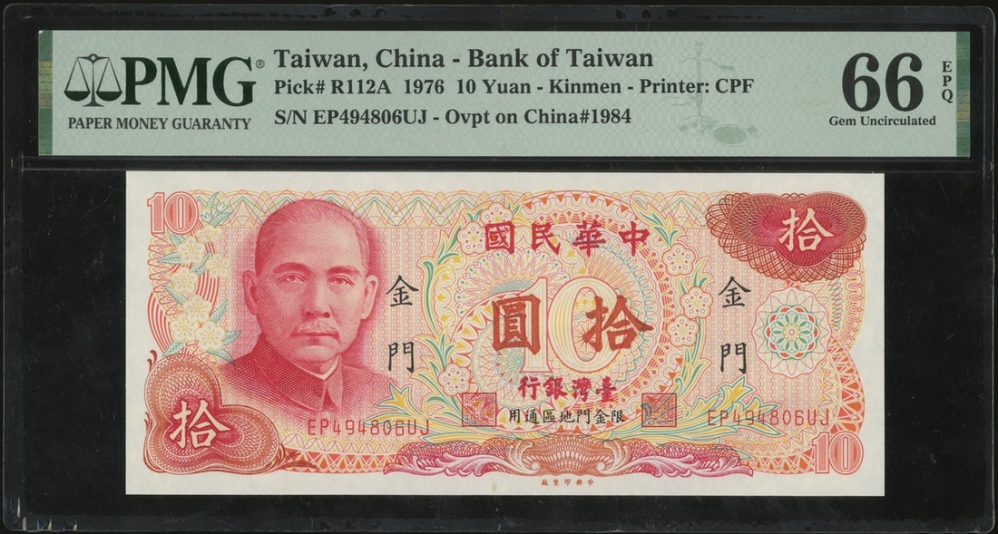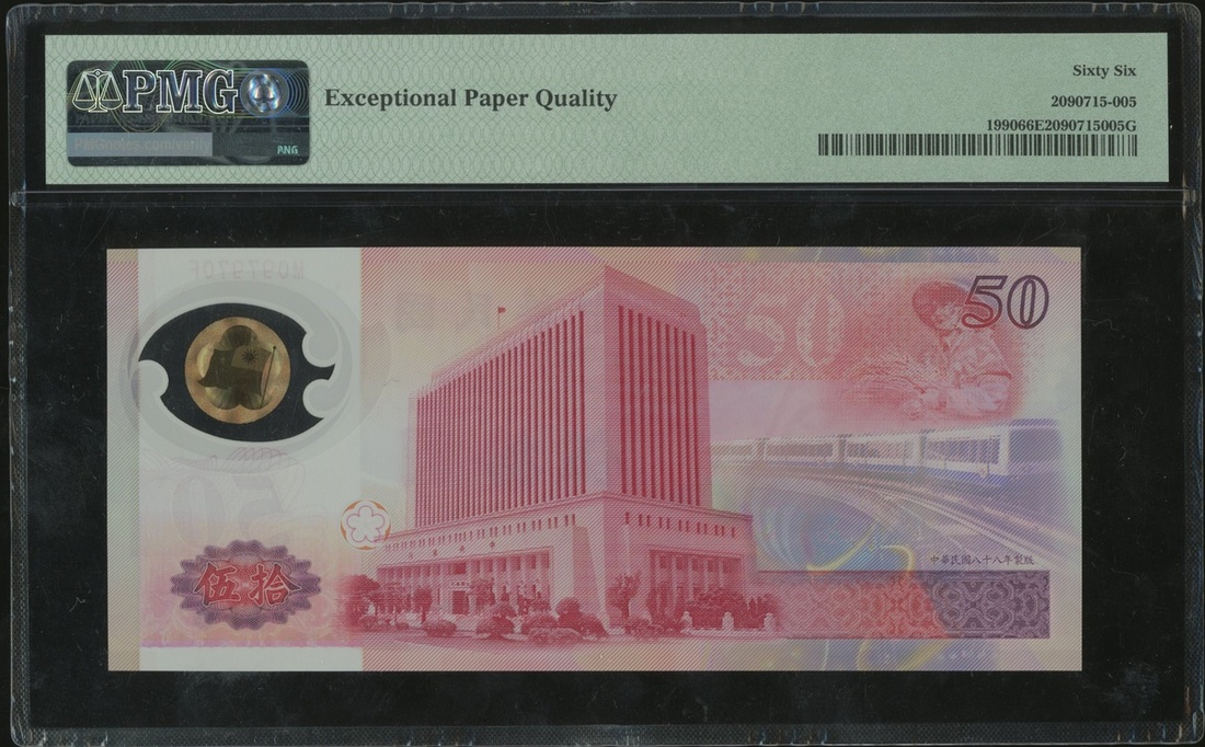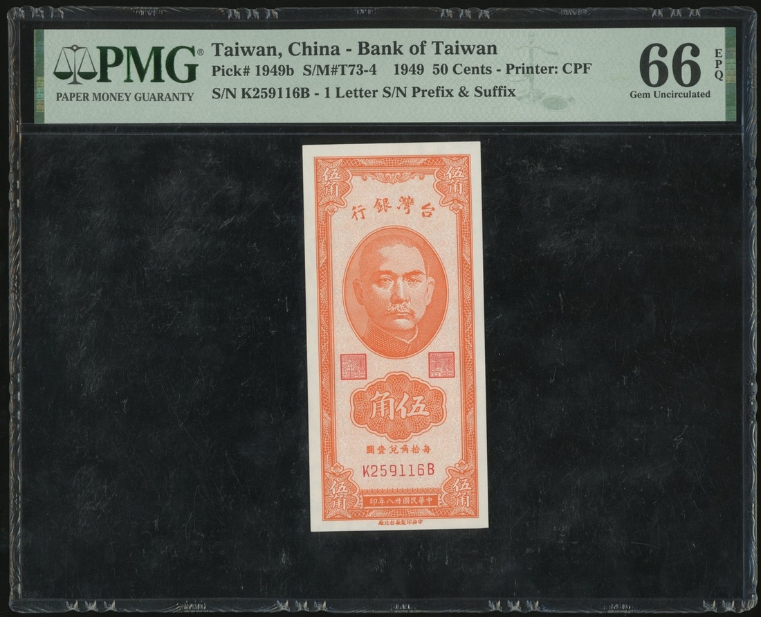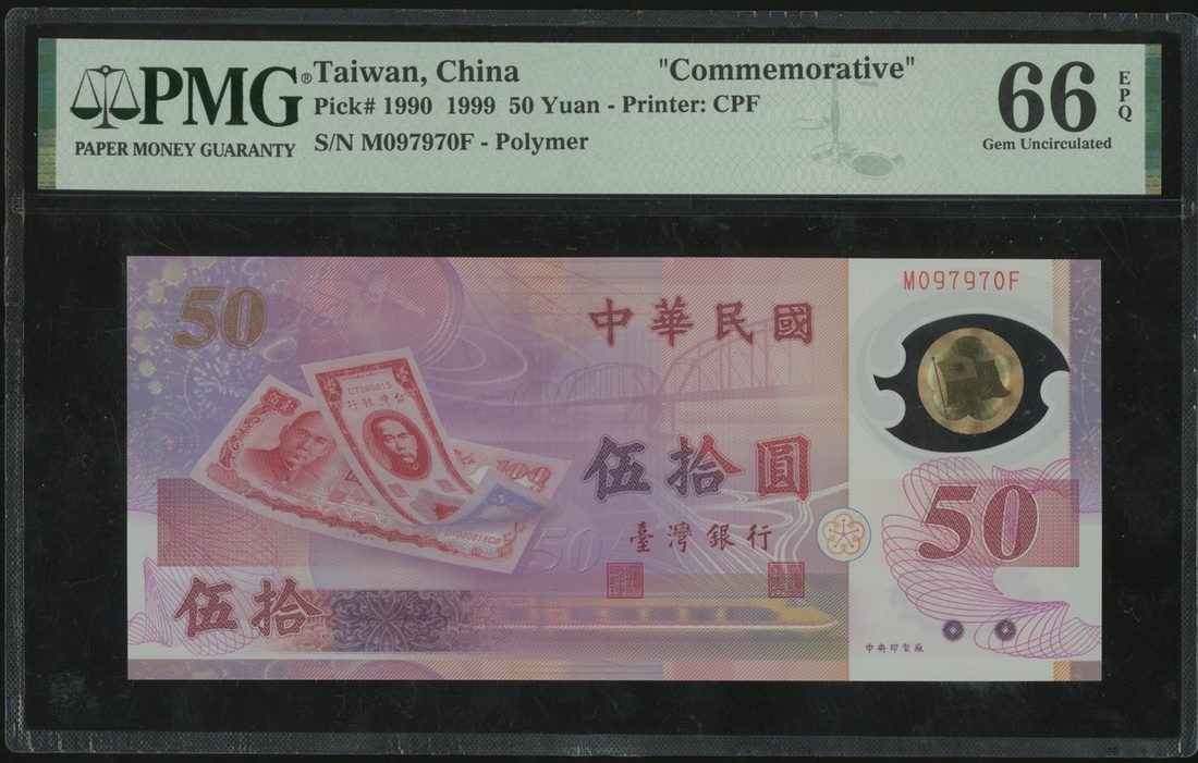 Bank of Taiwan, a group of 3 notes, consists of 50 cents, 1949, 10 yuan, Kinmen, 1976, and commemorative 50 yuan, 1999, serial numbers K259116B, EP494806UJ and fancy number M097970F, (Pick 1949b, R112A and 1990), all graded PMG 66EPQ Gem Uncirculated (3).