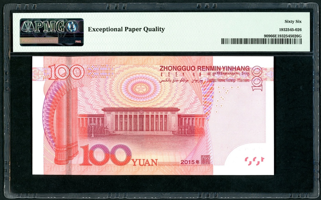 People's Bank of China, 100 yuan, 2015, lucky serial number U0C0000008, (Pick 909), PMG 66EPQ.