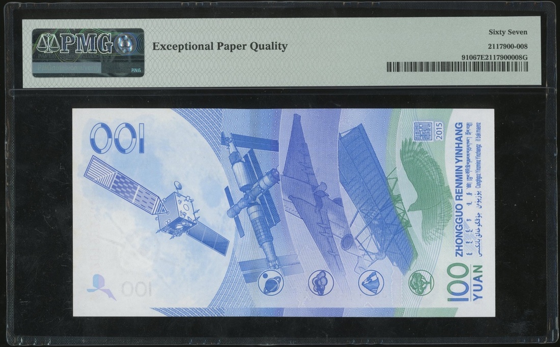 People's Bank of China, 100 Yuan, 2015, Aerospace Commemorative, serial number J2019035644, (Pick 910), PMG 67EPQ Superb Gem Uncirculated