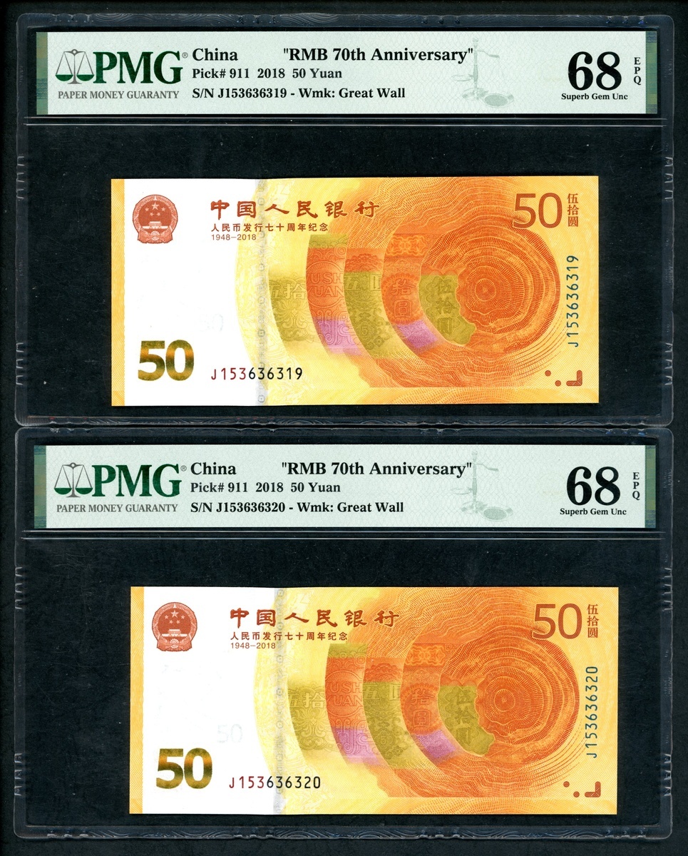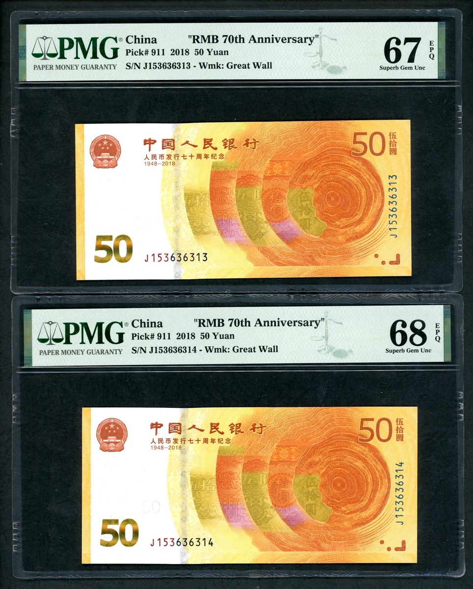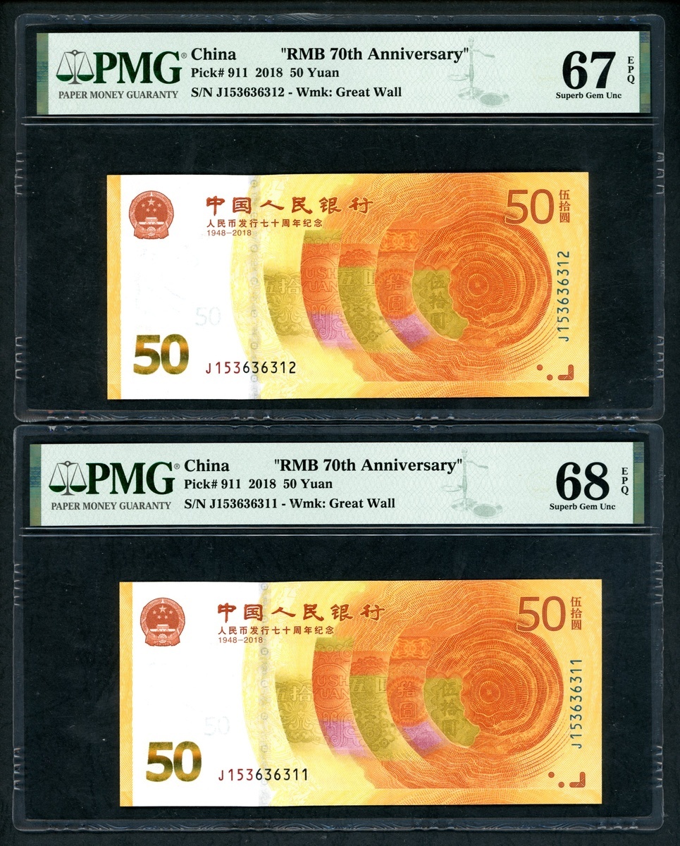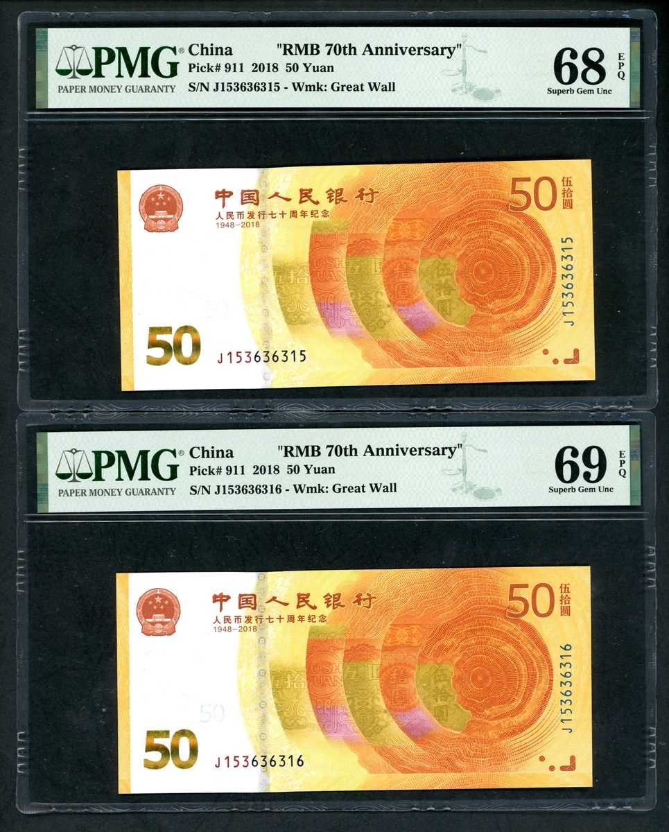 2018年中國人民銀行人民幣發行七十週年紀念50元連號10枚,編號 J153636311-320,316號評 PMG 69EPQ,312 及 313 評67EPQ,其餘68EPQ