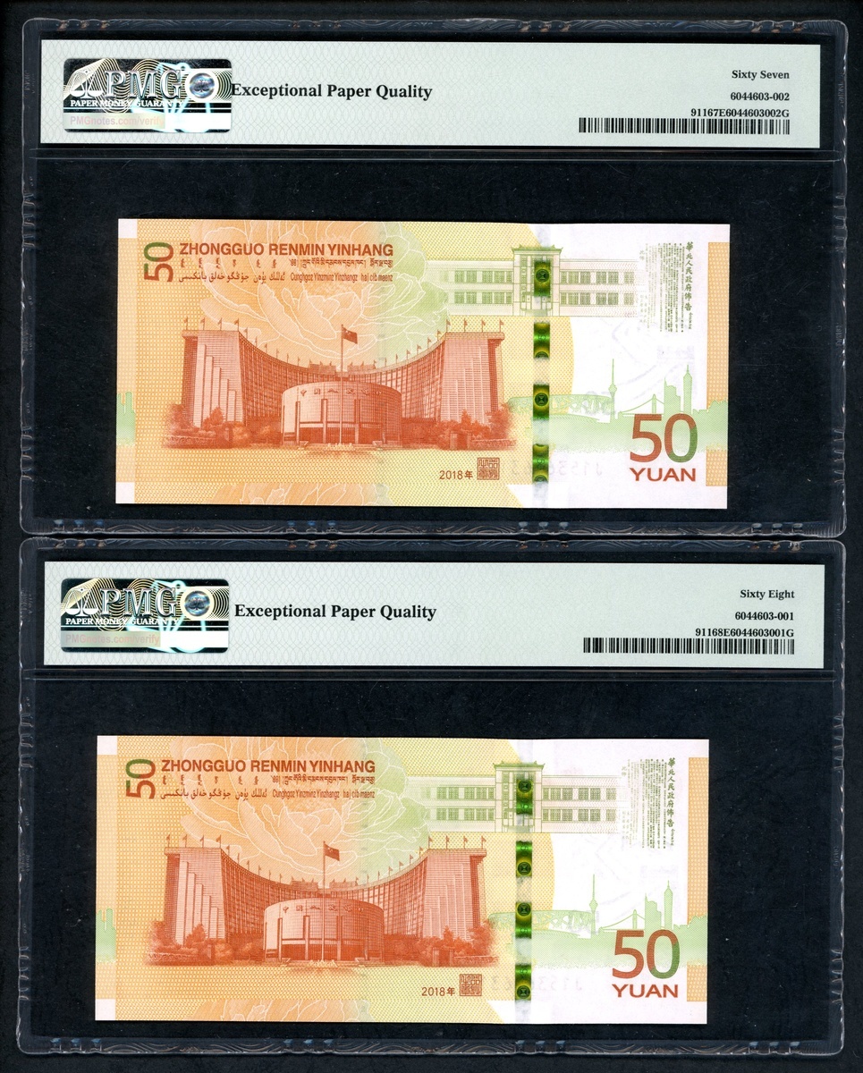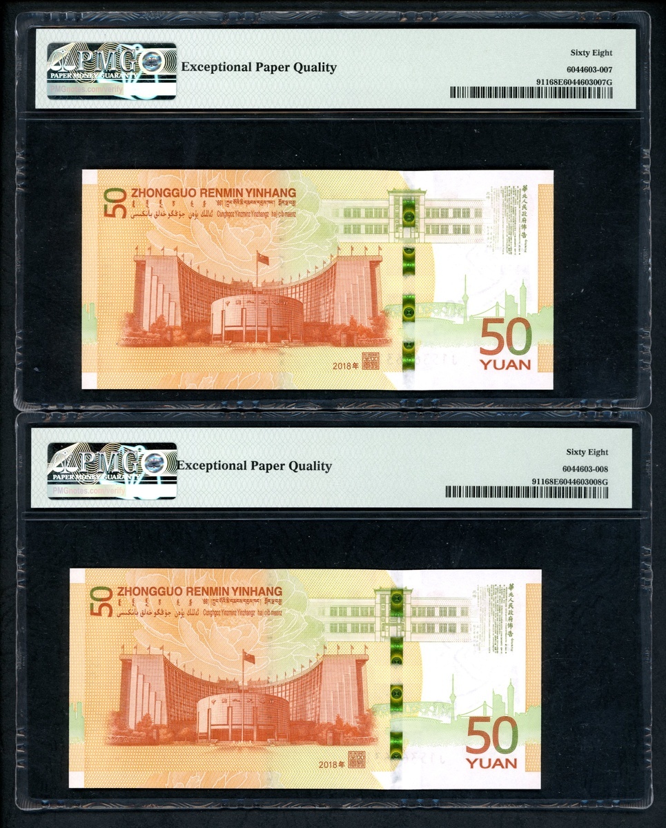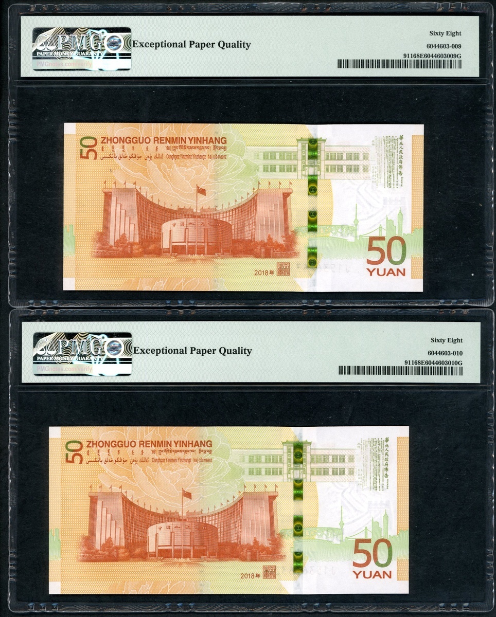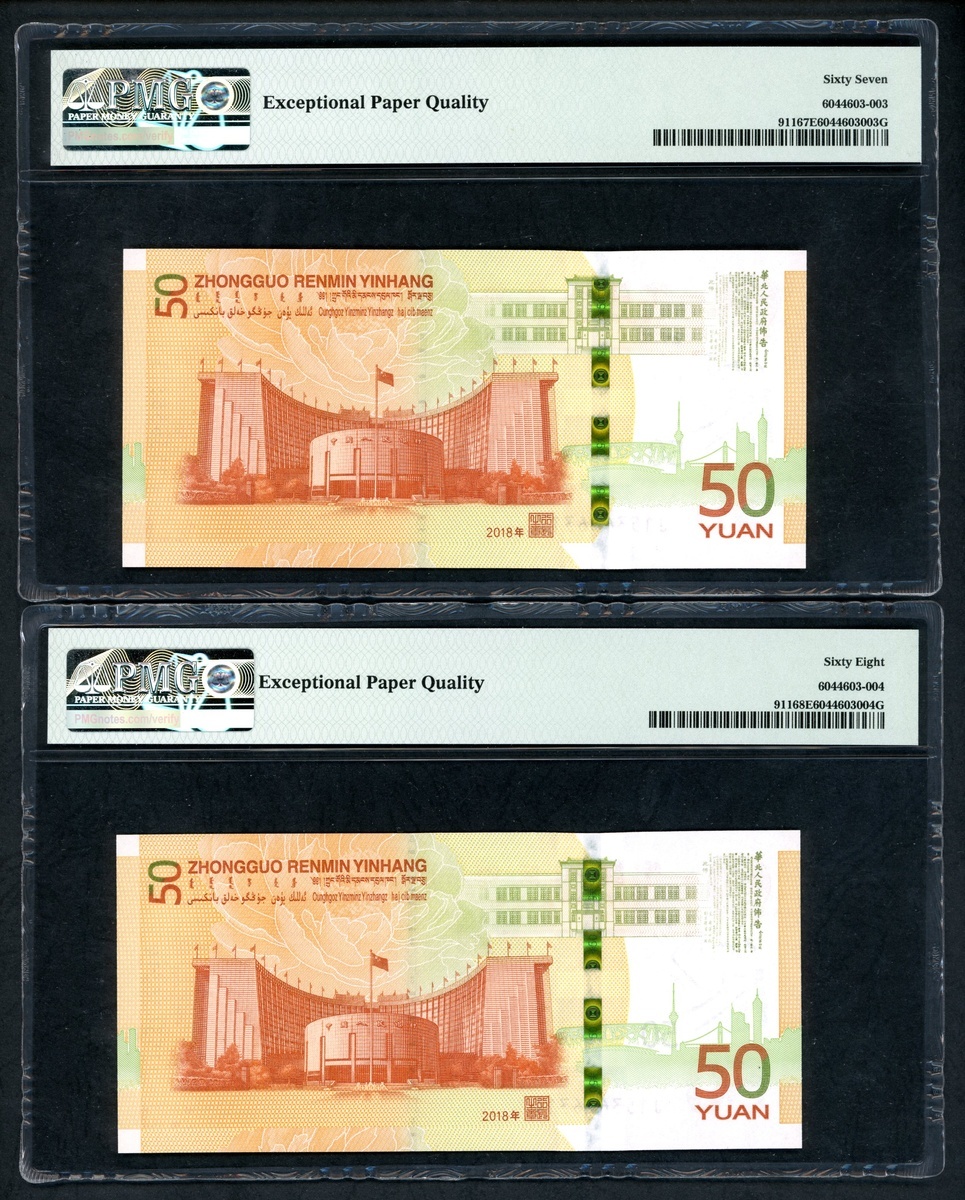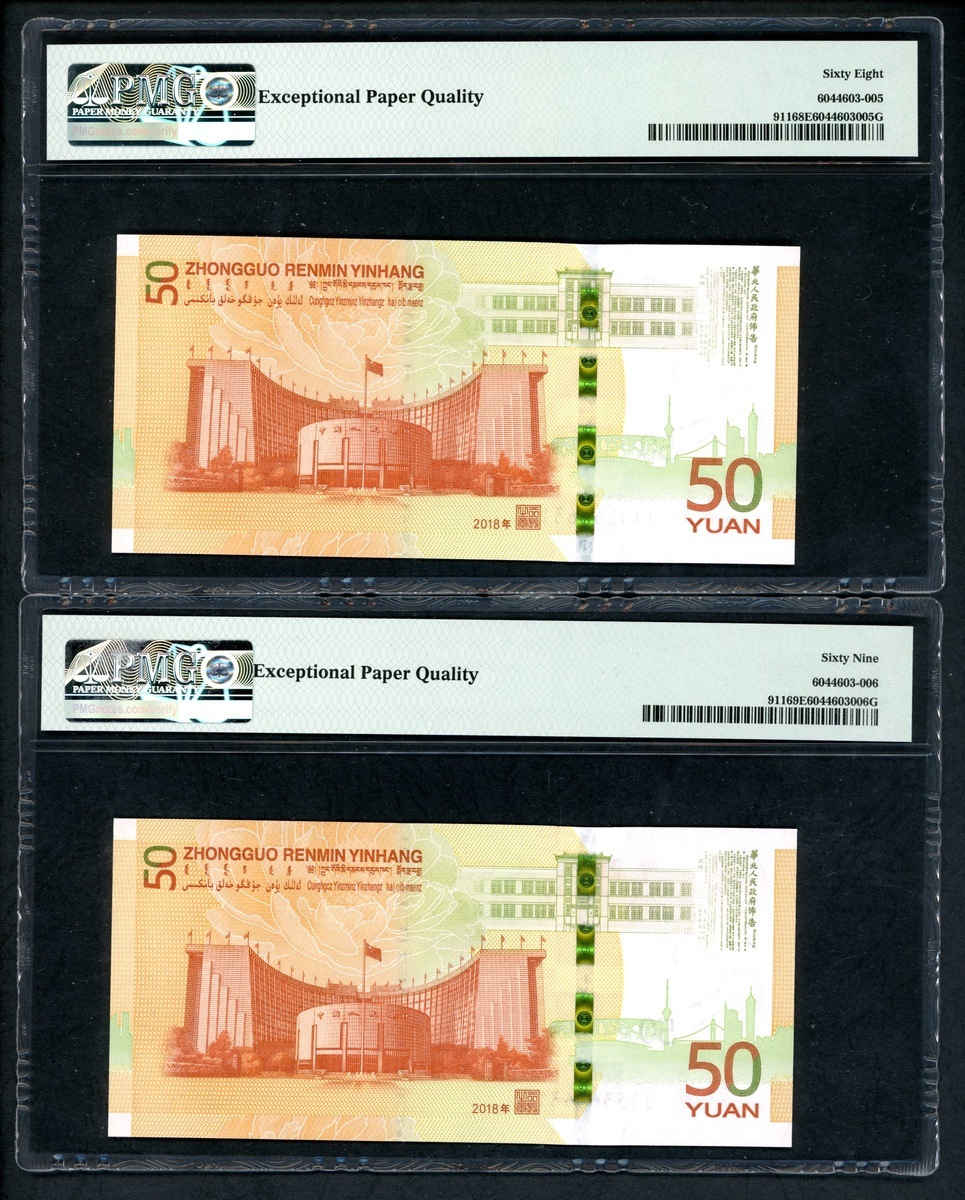 2018年中國人民銀行人民幣發行七十週年紀念50元連號10枚,編號 J153636311-320,316號評 PMG 69EPQ,312 及 313 評67EPQ,其餘68EPQ
