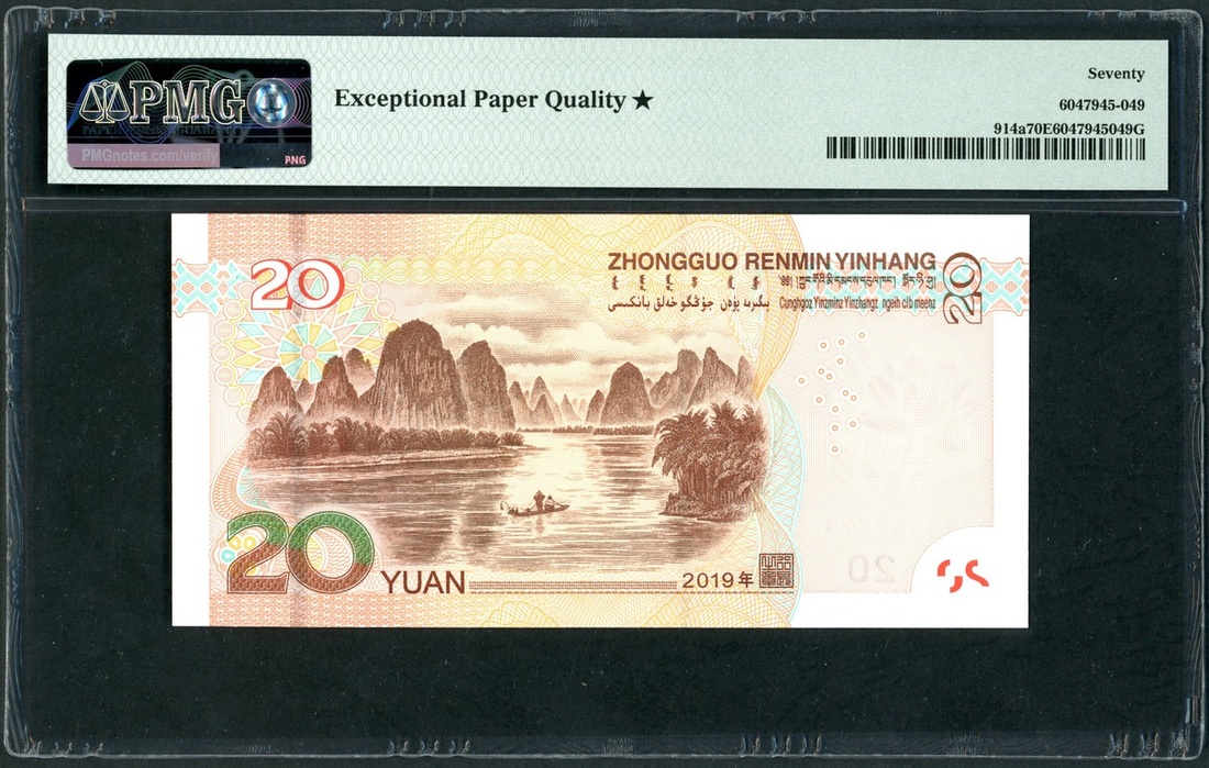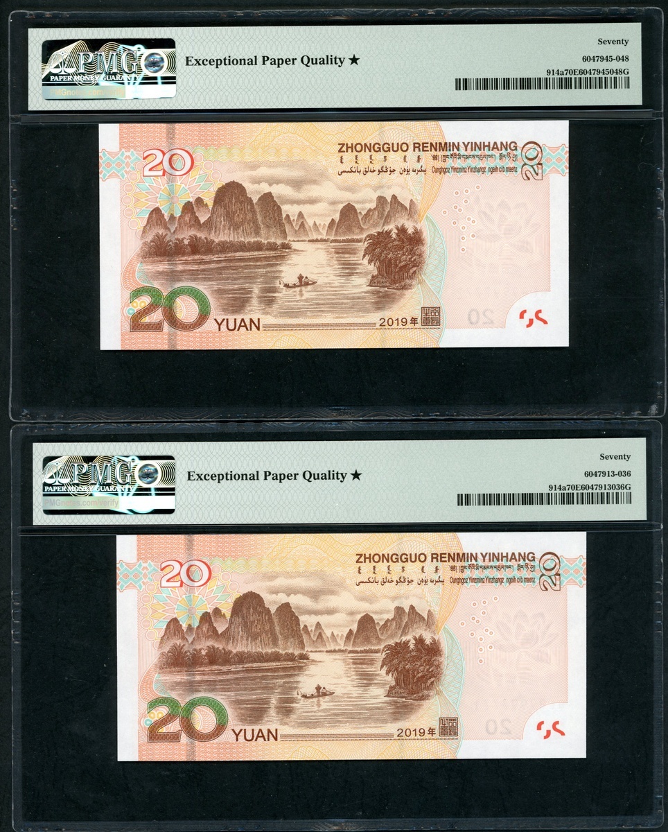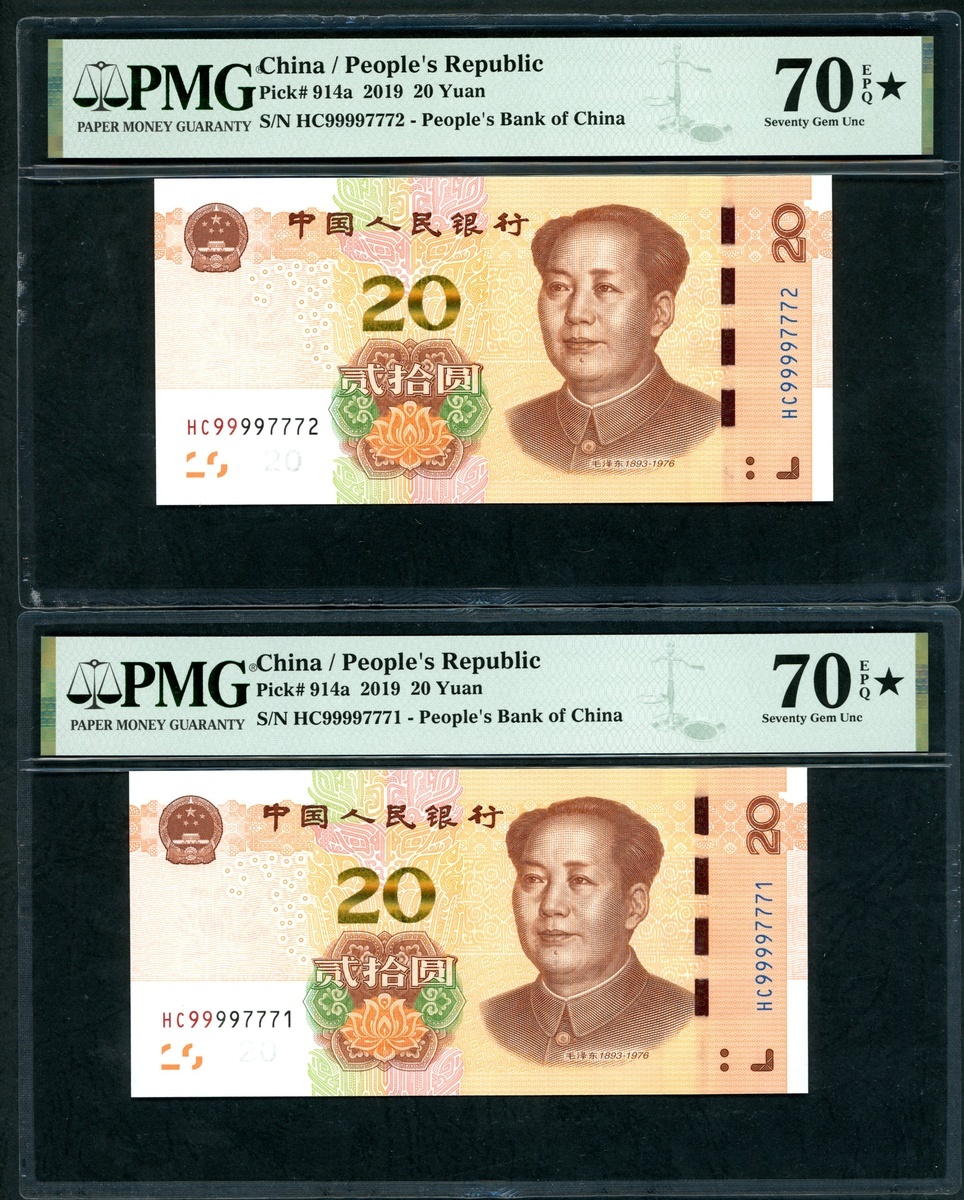 2019年中國人民銀行第五版人民幣20元3枚,連號HC99997771-73,均評PMG 70EPQ*