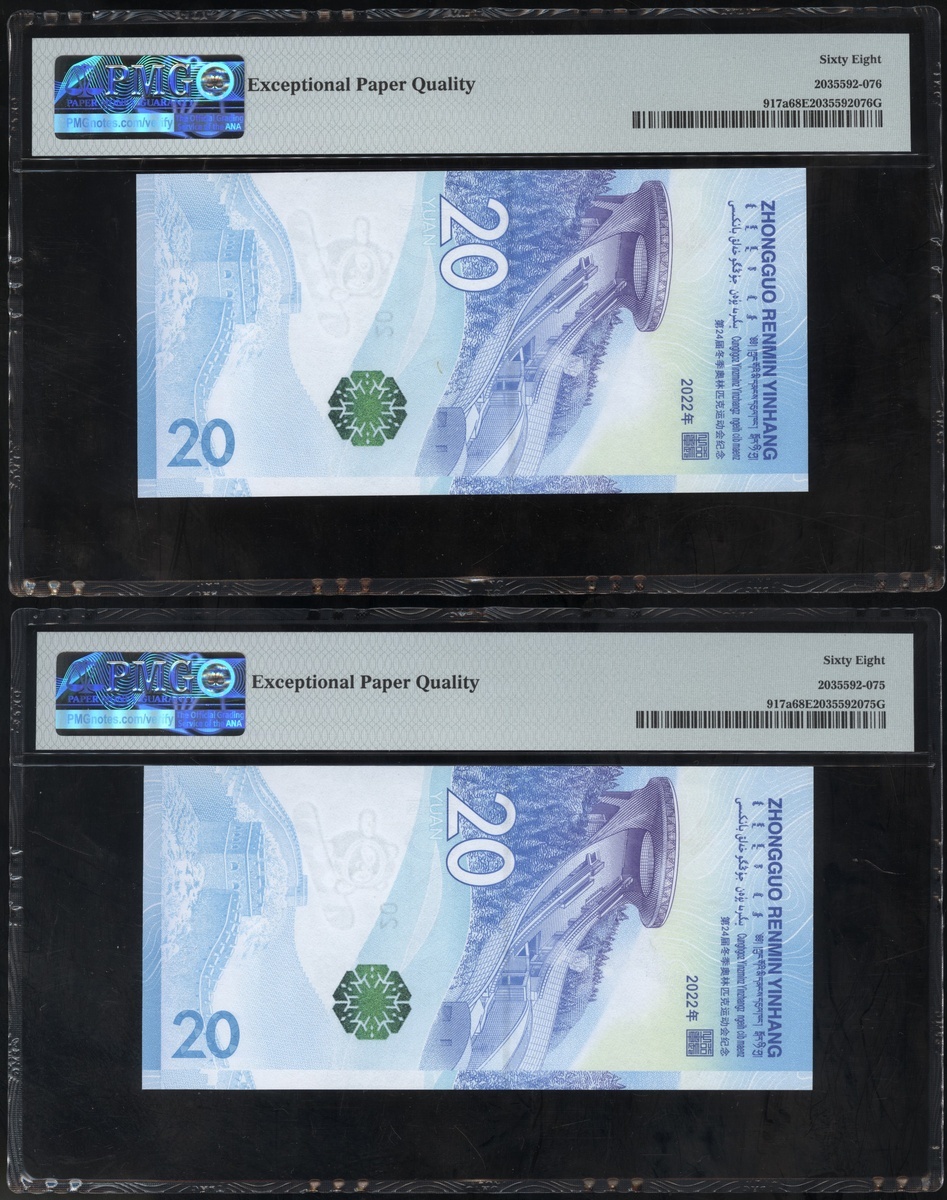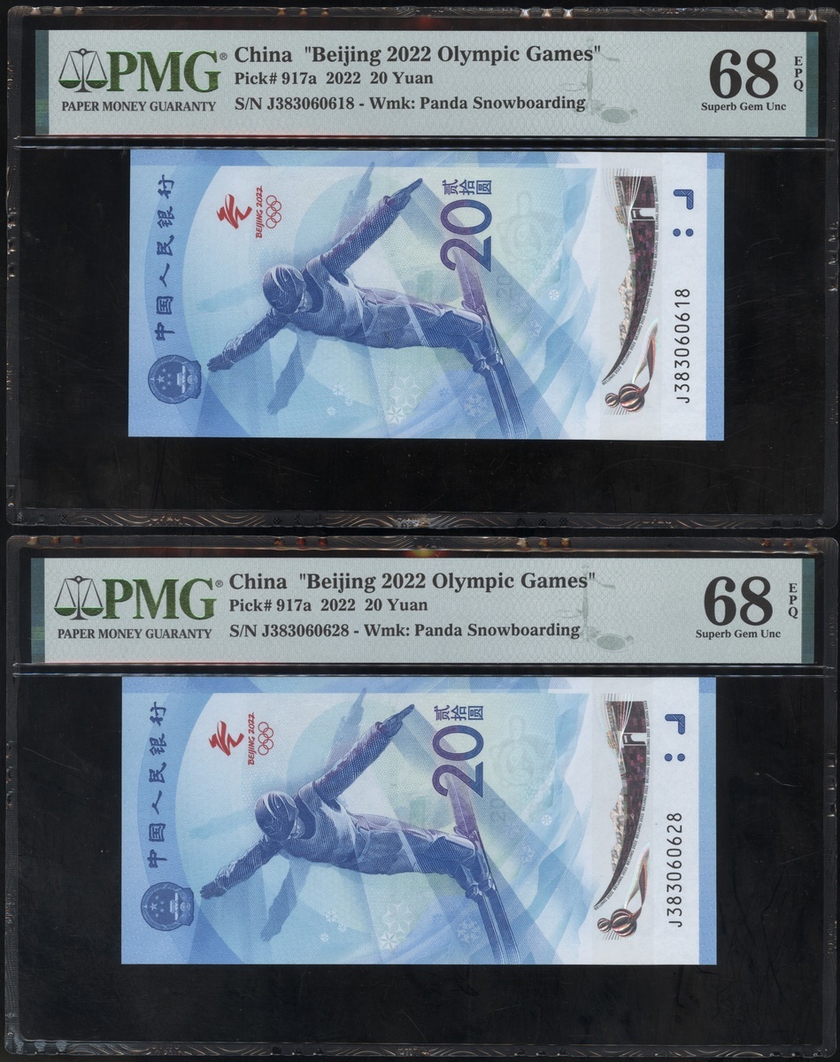 2022年中國人民銀行冬季奧運紀念20元2枚一組,編號J383060618及J383060628,均評PMG 68EPQ