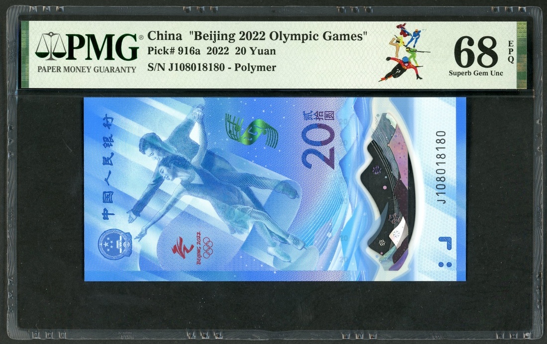 People's Bank of China, 20 yuan, polymer, 2022 Winter Olympics Commemorative, fancy serial number J108018180, (Pick 916a), PMG 68EPQ Superb Gem Uncirculated.