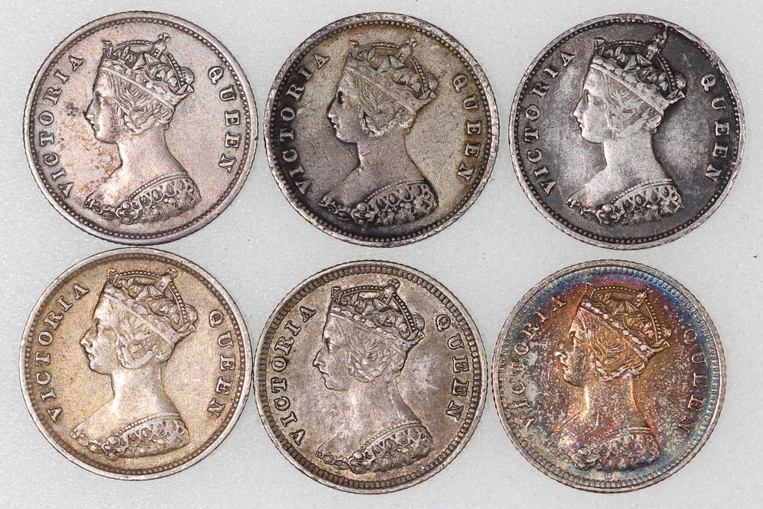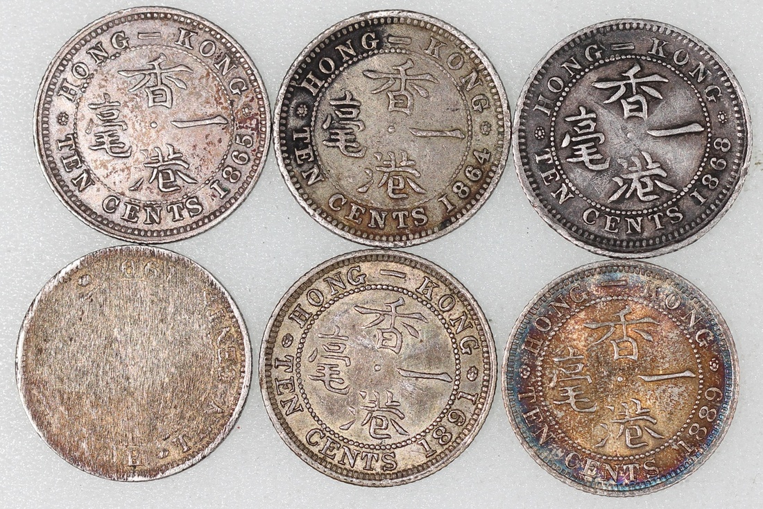 Hong Kong, a group of 6x 10 cents, 1864, 1865, 1868, 1889-H, 1891 and 1901, 1901 with reverse struck through error,