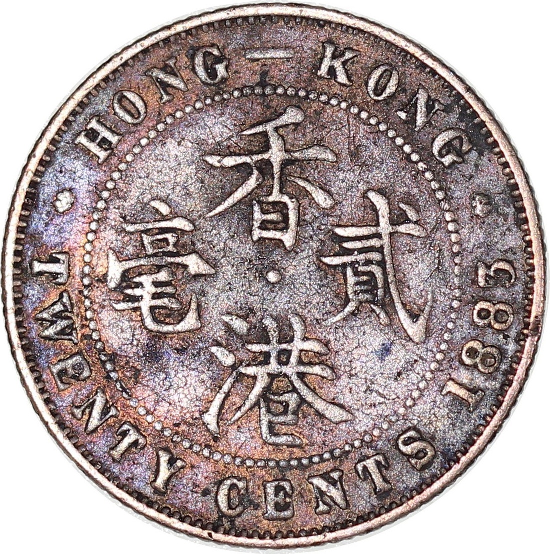 Hong Kong, silver 20 cents, 1883H, Victoria on obverse, surface probably damaged after burning, some stains or scratches, VF.