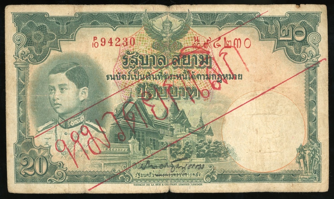 Government of Siam, Thailand, 20 baht, ND (1939), stamped cancelled in red on obverse, serial number P/10 94230, redemption date '27 April 1952 Bangkok Bank Limited' stamped on reverse,