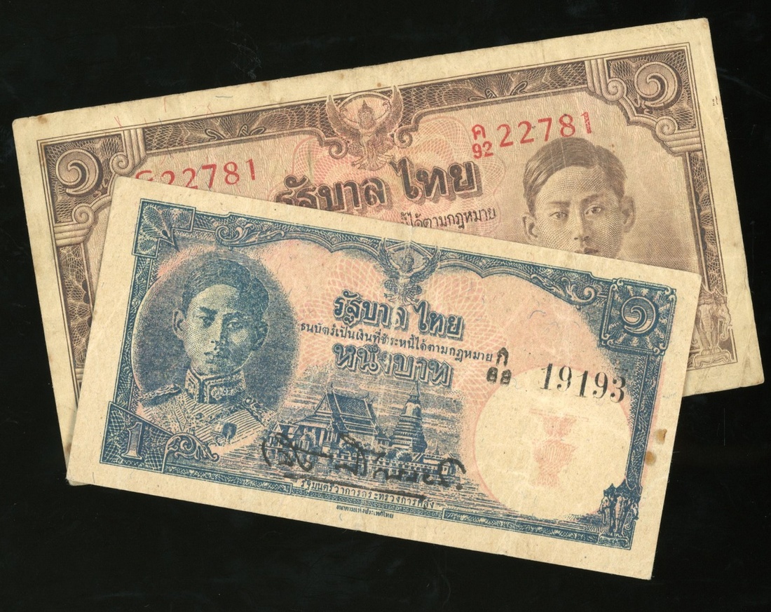 Government of Thailand, 1 baht, ND (1942-45), serial number C/92 22781, also a 1 baht, ND (1945),