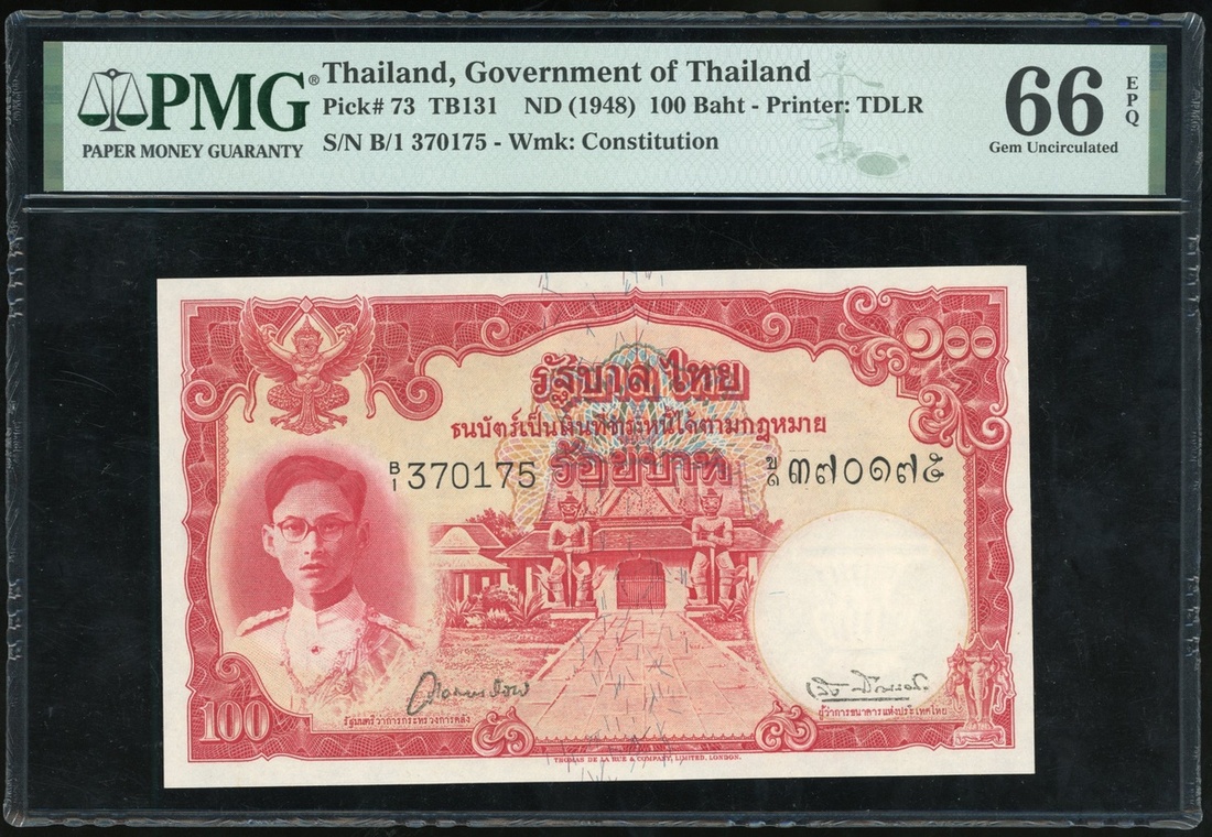 Thailand, 100 baht, ND(1948), serial number B/1 370175, (Pick 73), PMG 66EPQ.