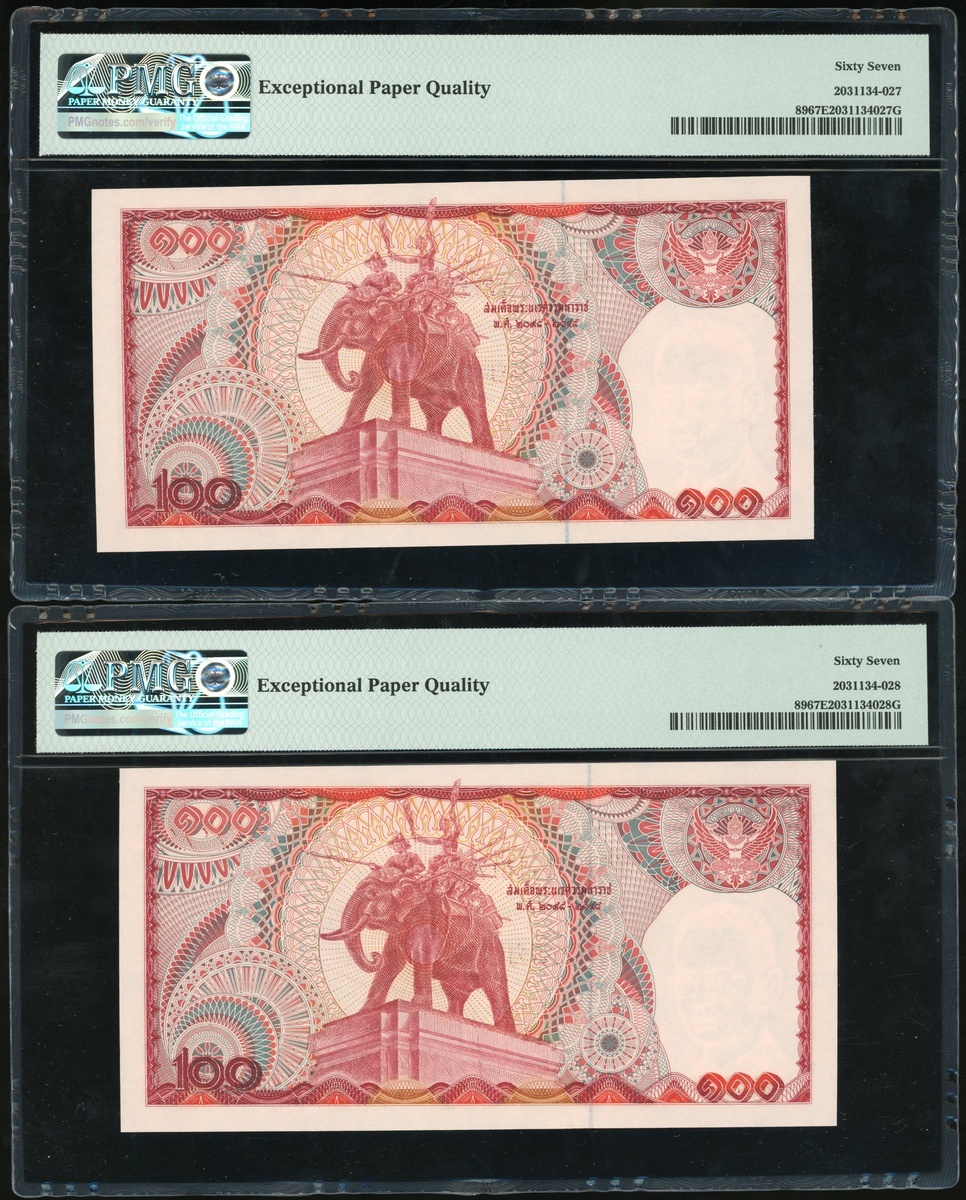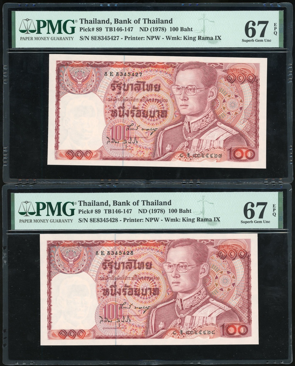 Bank of Thailand, a consecutive pair of 100 baht, ND(1978), serial numbers 8E8345427-428, (Pick 89), both graded PMG 67EPQ Superb Gem Uncirculated (2).