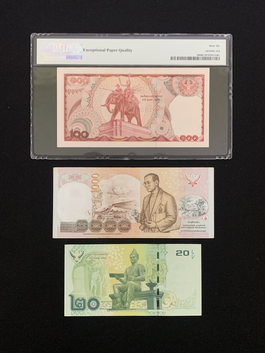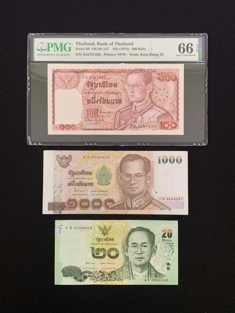 Bank of Thailand, a group of 3 notes, consists of 20, 100 and 1000 baht, 1978, serial numbers 4F 0802345, 1G5721420 and 7D 3643387, (Pick 87, 88 and 89), the 100 baht graded PMG 66EPQ, the rest extremely fine (3).