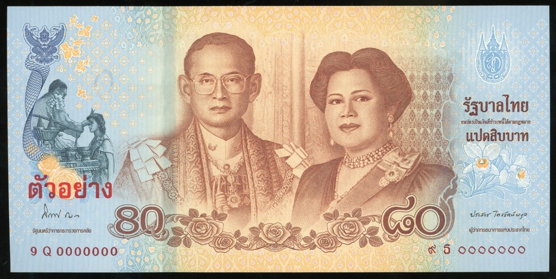 Bank of Thailand, 80 baht, specimen, 2012, specimen number 3369, serial number 9Q0000000, Queen Sirikit's 80th Birthday commemorative issue,