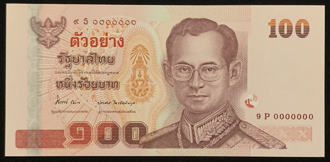 2012年泰國壹佰銖紀念鈔樣票,編號9P0000000,UNC