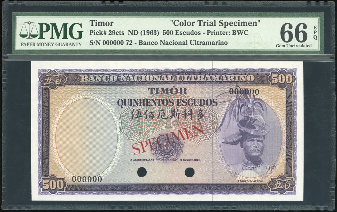 Banco Nacional Ultramarino, Timor, 500 escudos, 1963, colour trial specimen, serial number 000000, control number 72,