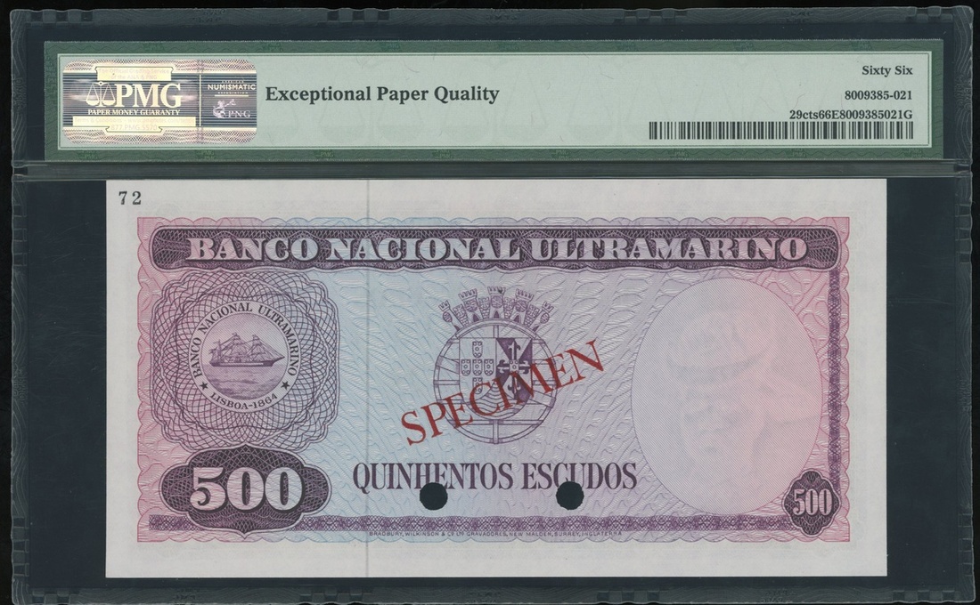 1963年葡屬帝汶大西洋國海外匯理銀行伍佰盾樣票,編號000000,PMG66EPQ