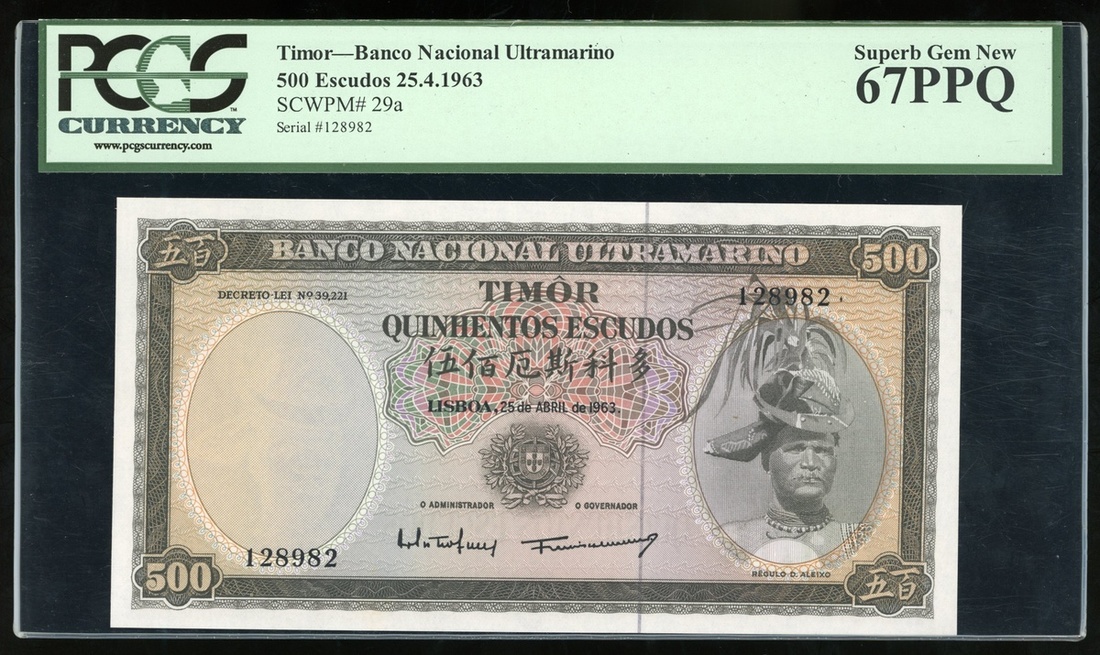Banco Nacional Ultramarino, Timor, 500 escudos, 25.4.1963, serial number 128982, (Pick 29a), PCGS 67PPQ Superb Gem New