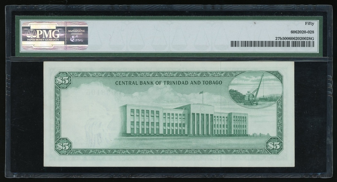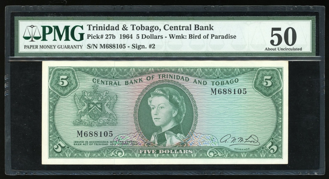 Trinidad & Tobago, $5, 1964, serial number M688105, (Pick 27b), PMG 50, about uncirculated.