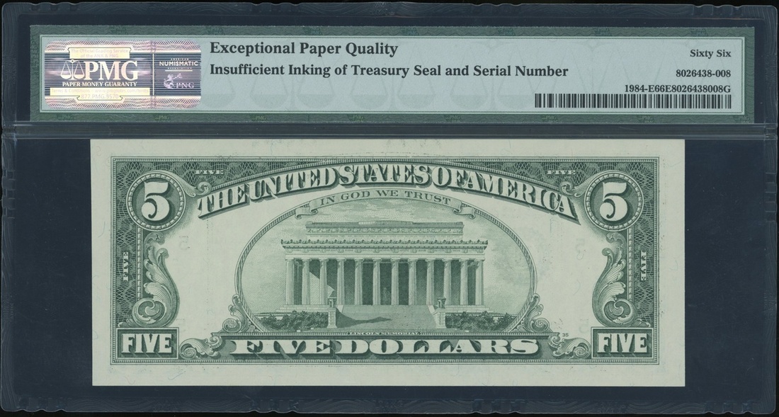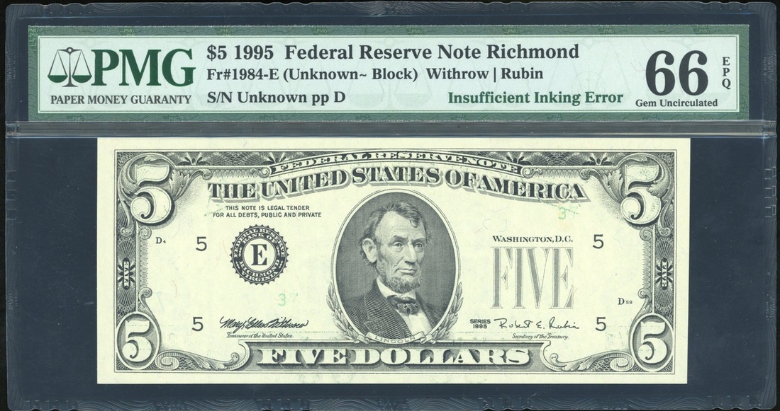 United States, Federal Reserve Note Richmond, ERROR $5, 1995, serial number and seal missing, (Fr#1984-E), PMG 66EPQ Gem Uncirculated (Insufficient Inking of Treasury Seal and Serial Number).