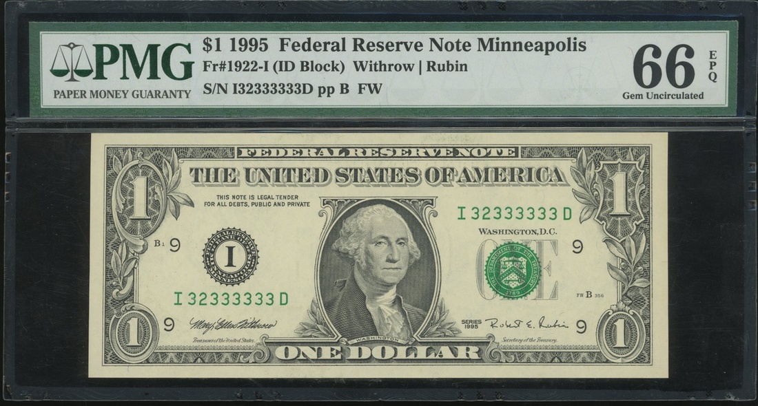 United States, Federal Reserve Note Minneapolis, $1, 1995, serial number I3233333D pp B, (Fr#1922-I), PMG 66EPQ Gem Uncirculated.