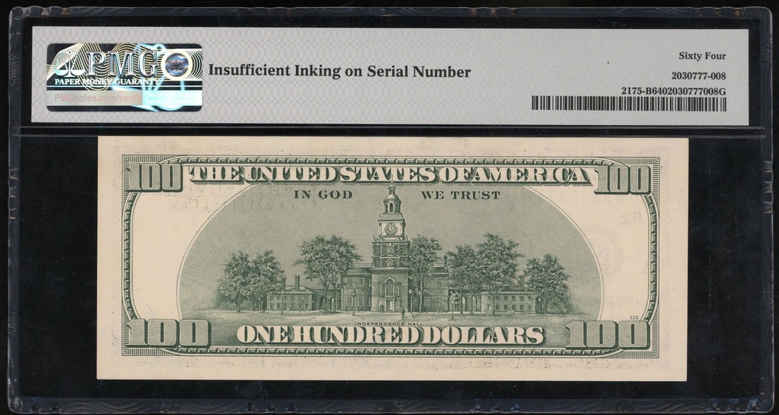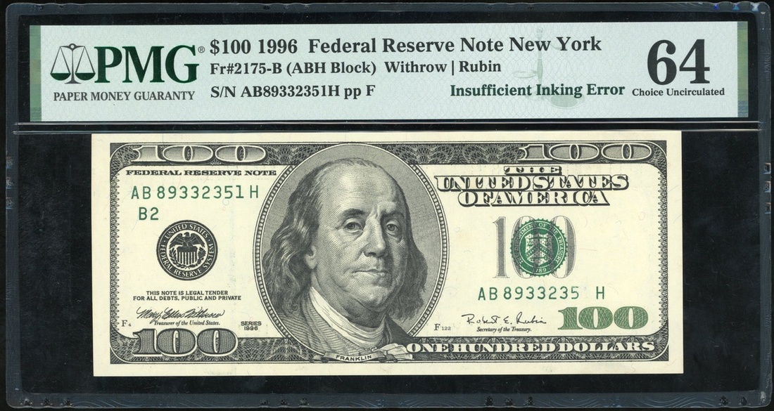 1996年美國壹佰圓錯體,編號油墨不足,編號AB89332351H,PMG64