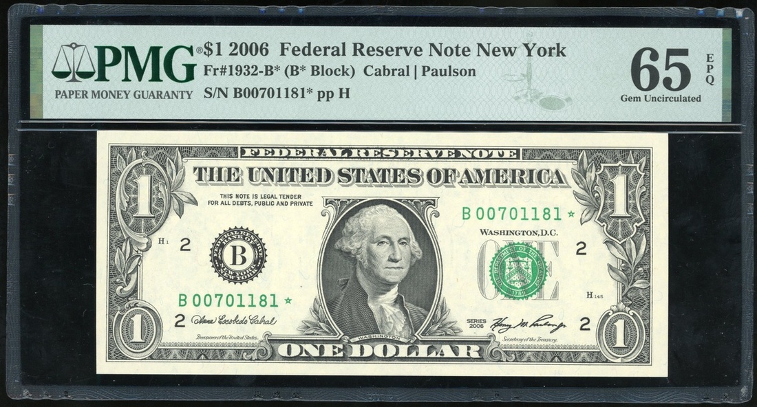 United States, Federal Reserve Note New York, replacement $1, 2006, serial number B00701181* pp H, (Fr#1932-B*) B* Block, PMG 65EPQ Gem Uncirculated.
