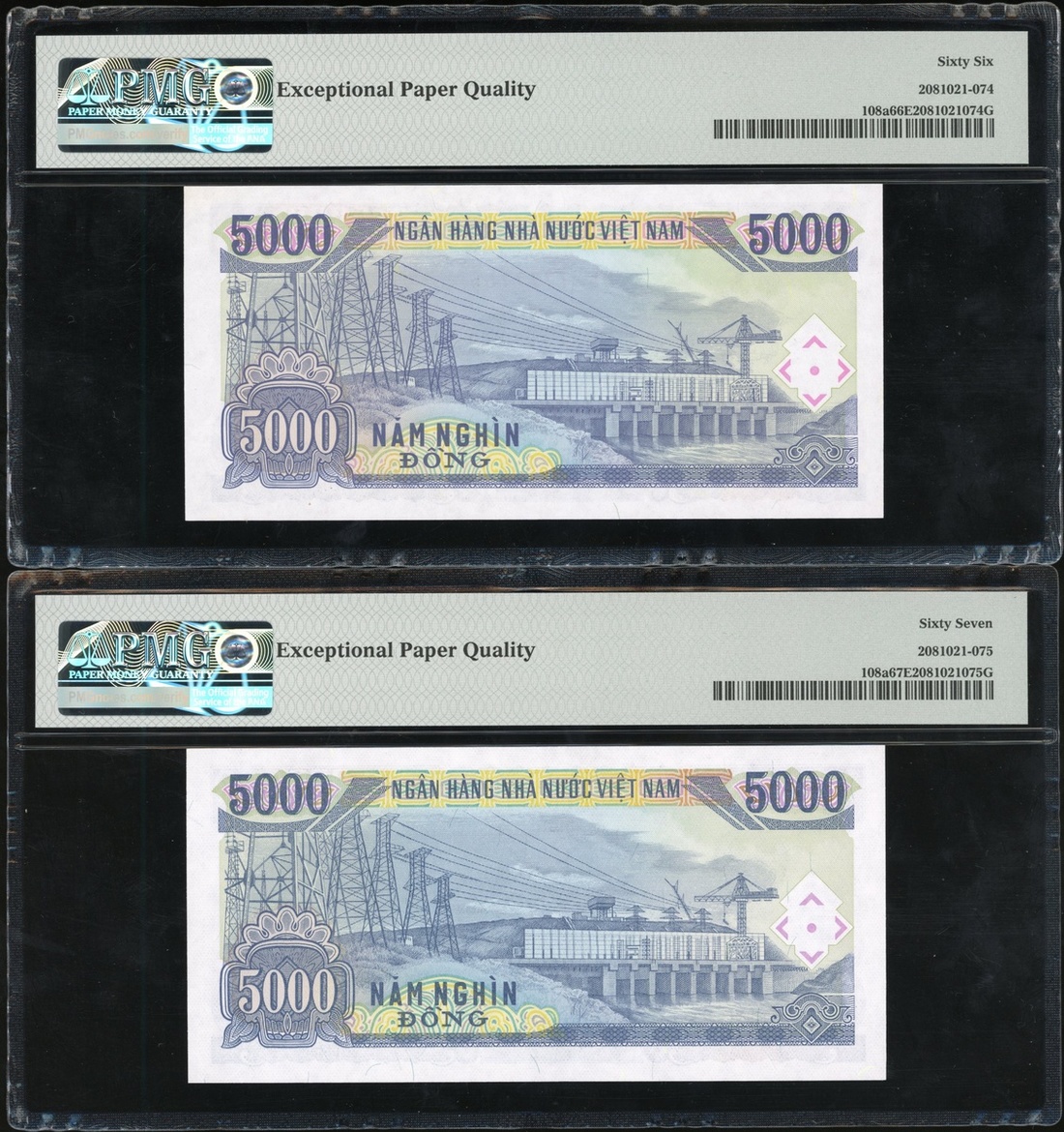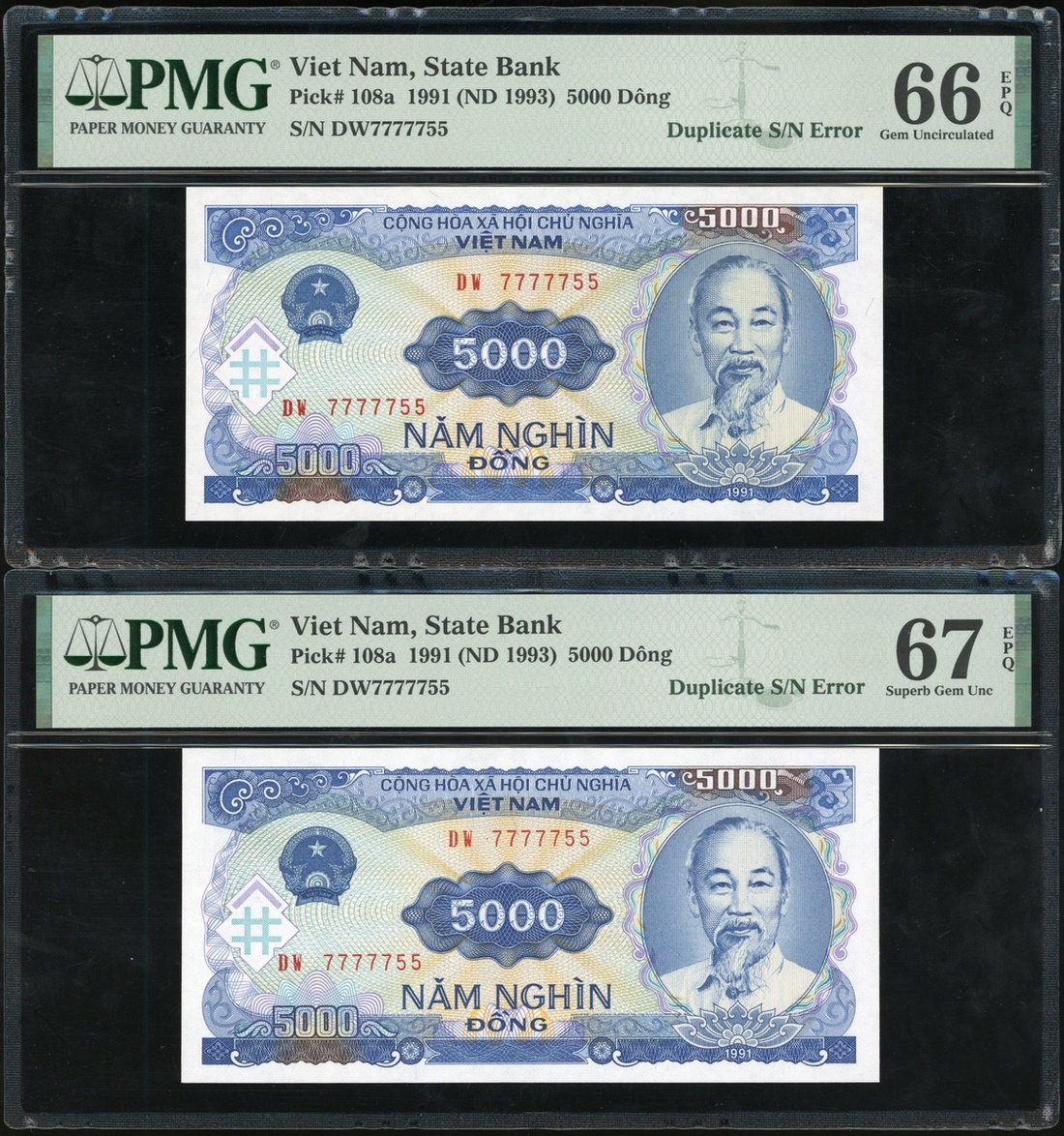 Viet Nam, State Bank, a pair of 5000 dong, duplicate serial number error, 1991 (ND 1993), serial number DW7777755, (Pick 108a), graded PMG 67EPQ and 66EPQ respectively (2).
