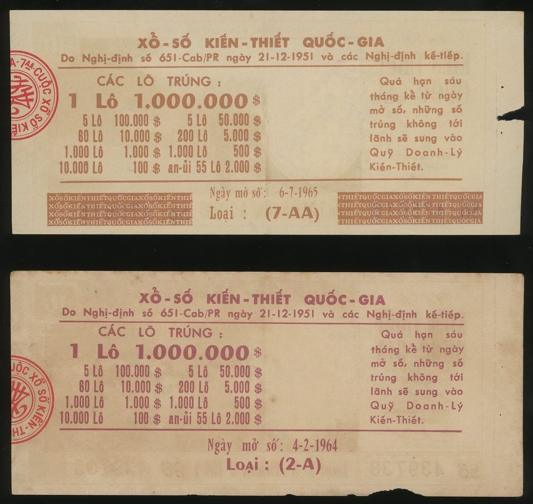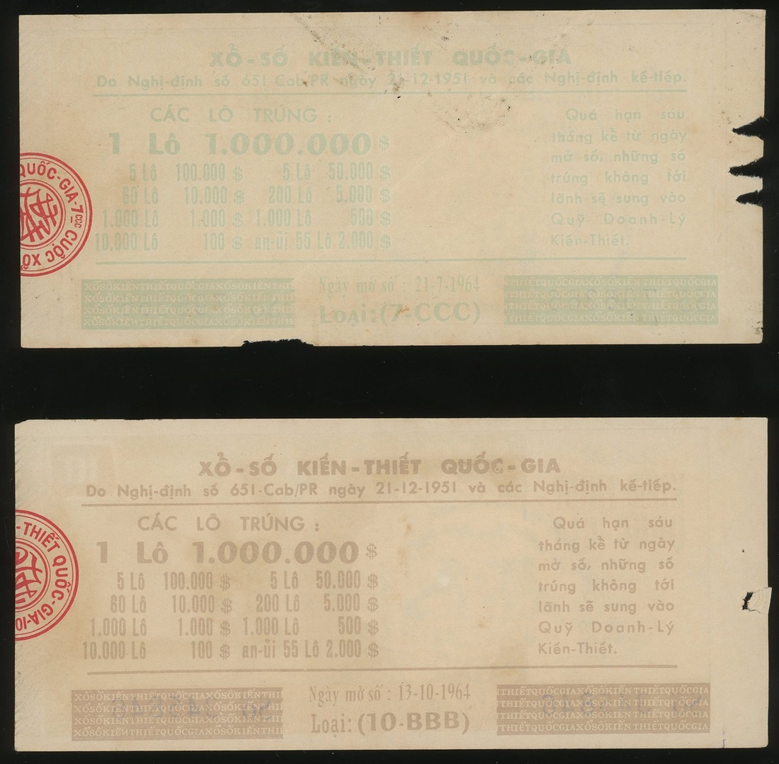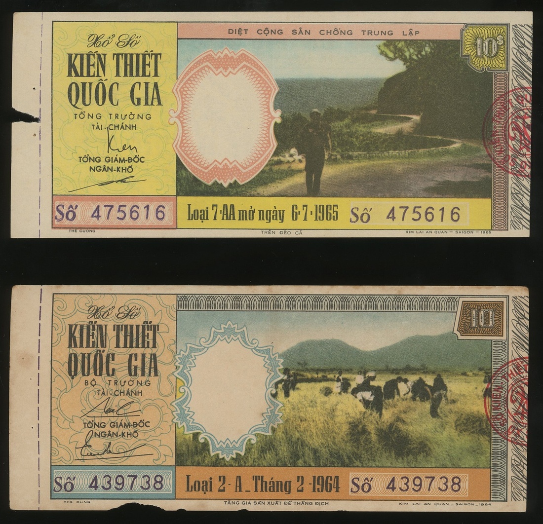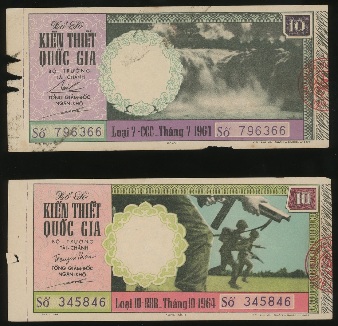 Vietnam Lottery Tickets, $10 (4), 1964-65, with damage at margins, otherwise extremely fine, interesting group (4)