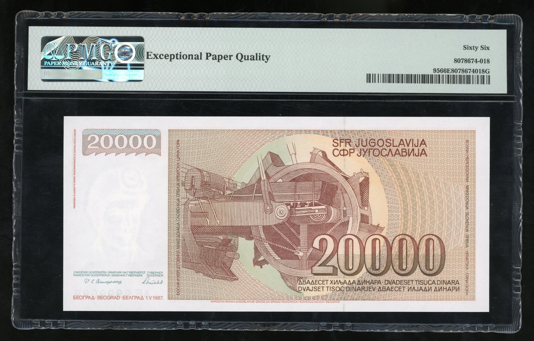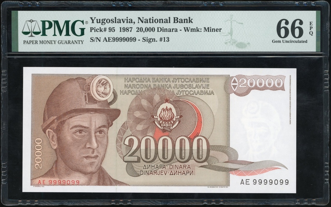 Yugoslavia, National Bank, 20000 dinara, 1987, fancy serial umber AE9999099, (Pick 95), PMG 66EPQ Gem Uncirculated.