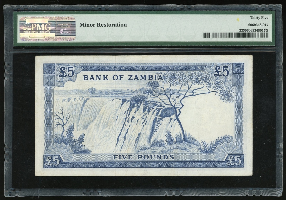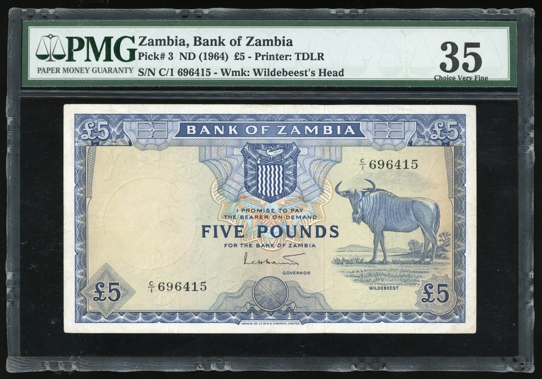 1964年尚比亞伍鎊,編號C/1 696415,PMG35